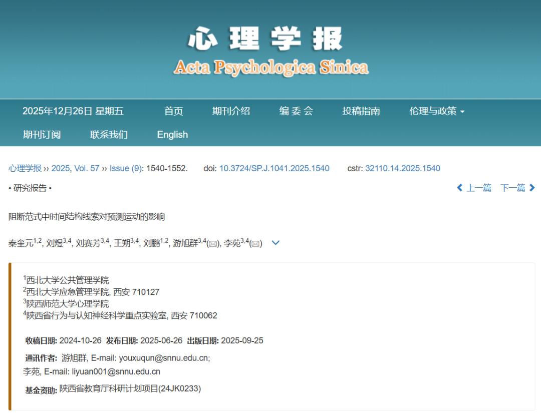 近日,必赢官网公共管理学院青年教师秦奎元博士联合陕西师范大学心理学院游旭群团队在《心理学报》上发表了一篇题为《阻断范式中时间结构线索对预测运动的影响》的研究成果。该研究首次在阻断范式下系统探究了时间结构对预测运动任务的影响,证实了时间结构一致能够显著提升个体在运动预测任务中的准确性和敏感性,并揭示了这一效应在视觉通道内的稳定性。