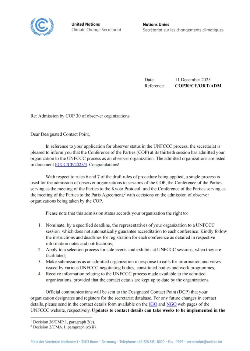 UNFCCC作为全球气候治理的核心机制,接纳全球政府组织与各类机构团体两个类别的组织以观察员身份参与国际气候谈判、分享各国气候行动经验。截至目前,全球仅3000余家机构获非政府组织观察员的资格,中国内地单位占比不足2%,其中获批高校包括清华大学、中国人民大学、厦门大学、中央财经大学、北京理工大学等。此次437ccm·必赢国际的成功获批,为我国高校深度参与气候变化多边进程提供了新支点。
