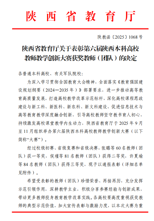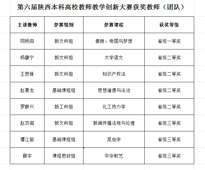 近日,陕西省教育厅公布了第六届陕西本科高校教师教学创新大赛获奖名单,必赢官网文化遗产学院同杨阳教师团队获省级一等奖,文学院杨馥宁教师团队、法学院王思锋教师团队、马克思主义学院赵景龙教师团队和化工学院罗群兴教师团队获省级二等奖,新闻传播学院赵双阁教师团队、生命科学学院谭江丽教师团队和体育教研部薛宇教师团队获省级三等奖。