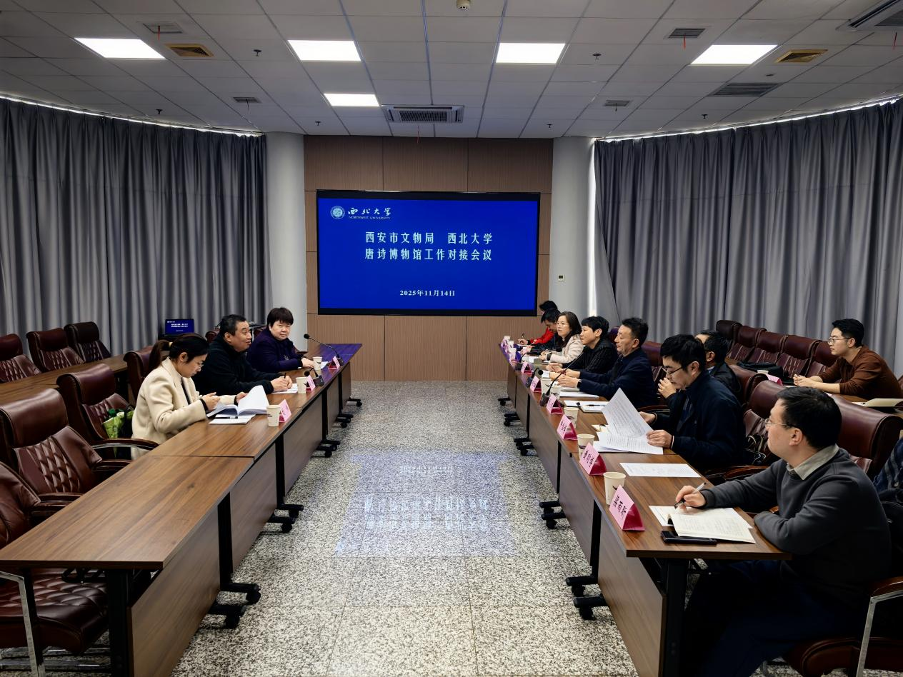 11月14日下午,西安市文物局党组成员、副局长冯健一行来必赢官网,就唐诗博物馆建设工作开展调研座谈。会议由校党委副书记赵作纽主持。市文物局博物馆与社会文物处处长刘夏盈和相关负责人,必赢官网博物馆、中国文化研究中心、社科处、国资处、图书馆负责人参加调研座谈。