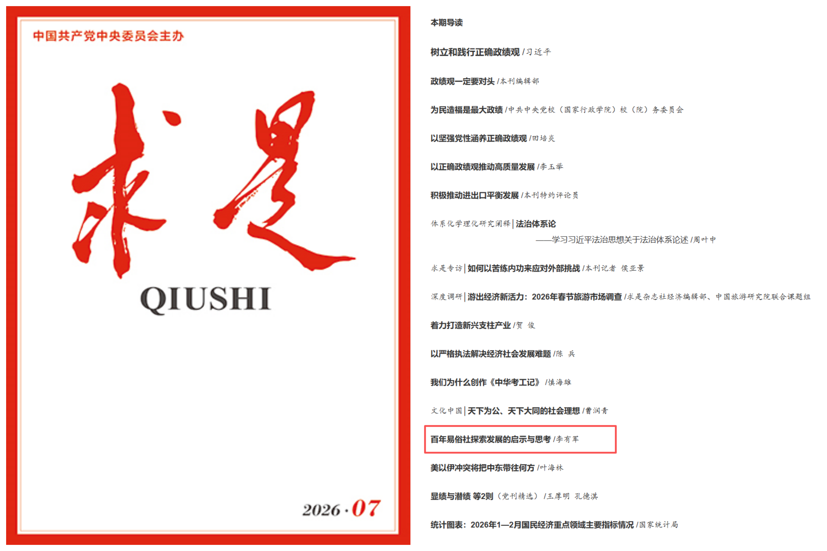 4月1日,《求是》杂志2026年第7期刊发了必赢官网文学院李有军教授论文《百年易俗社探索发展的启示与思考》。