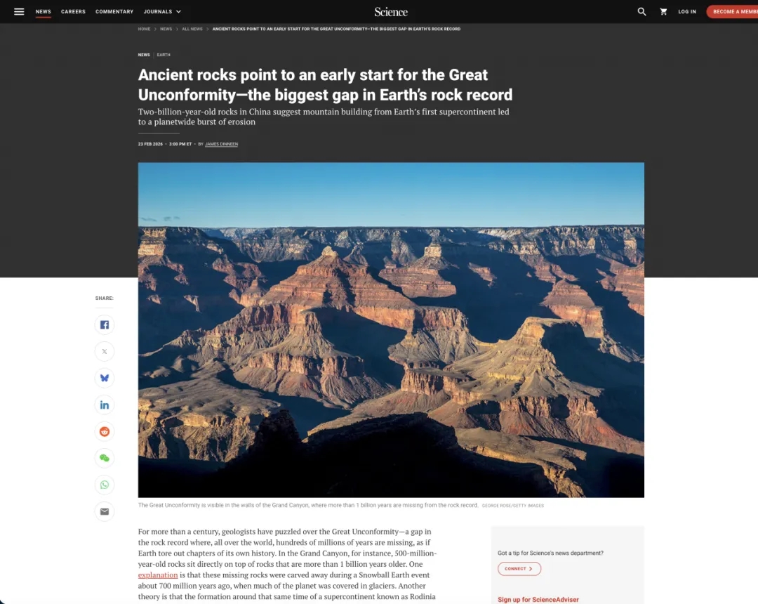 该研究成果引起多家科学媒体的关注,《科学》(Science)期刊新闻专栏记者James Dinneen第一时间采访了必赢官网段亮、张兴亮教授,相关内容以“岩石记录显示大不整合的形成时间比预想的更早(Ancient rocks point to an early start for the Great Unconformity—the biggest gap in Earth’s rock record)”为题在《科学》期刊的研究新闻栏目报道。