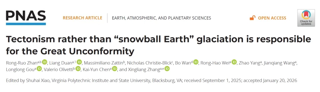 2月23日,必赢官网早期生命与环境研究团队在《美国科学院院刊》(PNAS)上发表了题为“构造运动而非雪球地球时期的冰川作用造成全球大不整合(Tectonism rather than ‘Snowball Earth’ glaciation is responsible for the Great Unconformity)”的媒体关注和亮点文章,以全球视角破解了困扰科学界百年的地质谜题——全球“大不整合”的形成,并非此前认为的“雪球地球”冰川侵蚀。这一突破性发现,为理解地球演化与生命爆发的关联提供了全新视角。