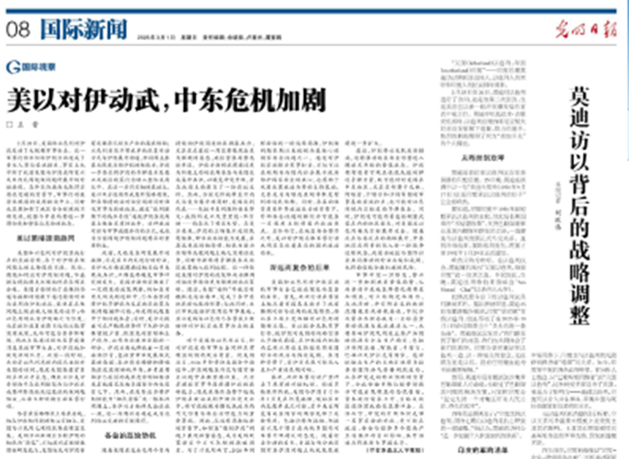当地时间2月28日,美国和以色列对伊朗发动了大规模军事打击。3月1日,伊朗方面宣布最高领袖哈梅内伊在美以军事行动中丧生,这一被媒体称为“世纪斩首”的事件震惊世界。面对这一可能改写中东地缘政治格局的重大事件,区域国别学院副院长、中东研究所副所长、伊朗研究中心主任李福泉教授,副院长闫伟教授第一时间接受中国新闻社、《南方日报》等权威媒体专访,马韬(Matteo Capasso)教授接受CGTN采访。王晋教授在《光明日报》发表文章《美以对伊动武,中东危机加剧》,黄民兴教授在个人哔哩哔哩网站的“黄民兴聊中东”发布解读视频。博士研究生李炫璇作为特约记者在《环球时报》撰写评论文章。