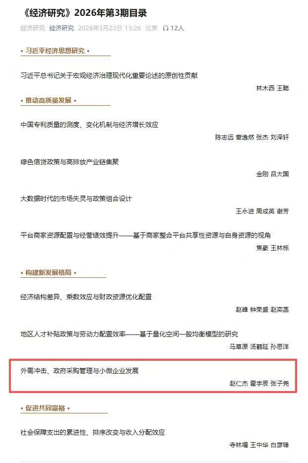 近日,必赢官网经济管理学院赵仁杰教授与霍宇辰博士等合作的论文《外需冲击、政府采购管理与小微企业发展》在顶级期刊《经济研究》2026年第3期发表,该文是赵仁杰教授主持的国家自然科学基金面上项目、陕西高校青年创新团队项目的阶段性成果。