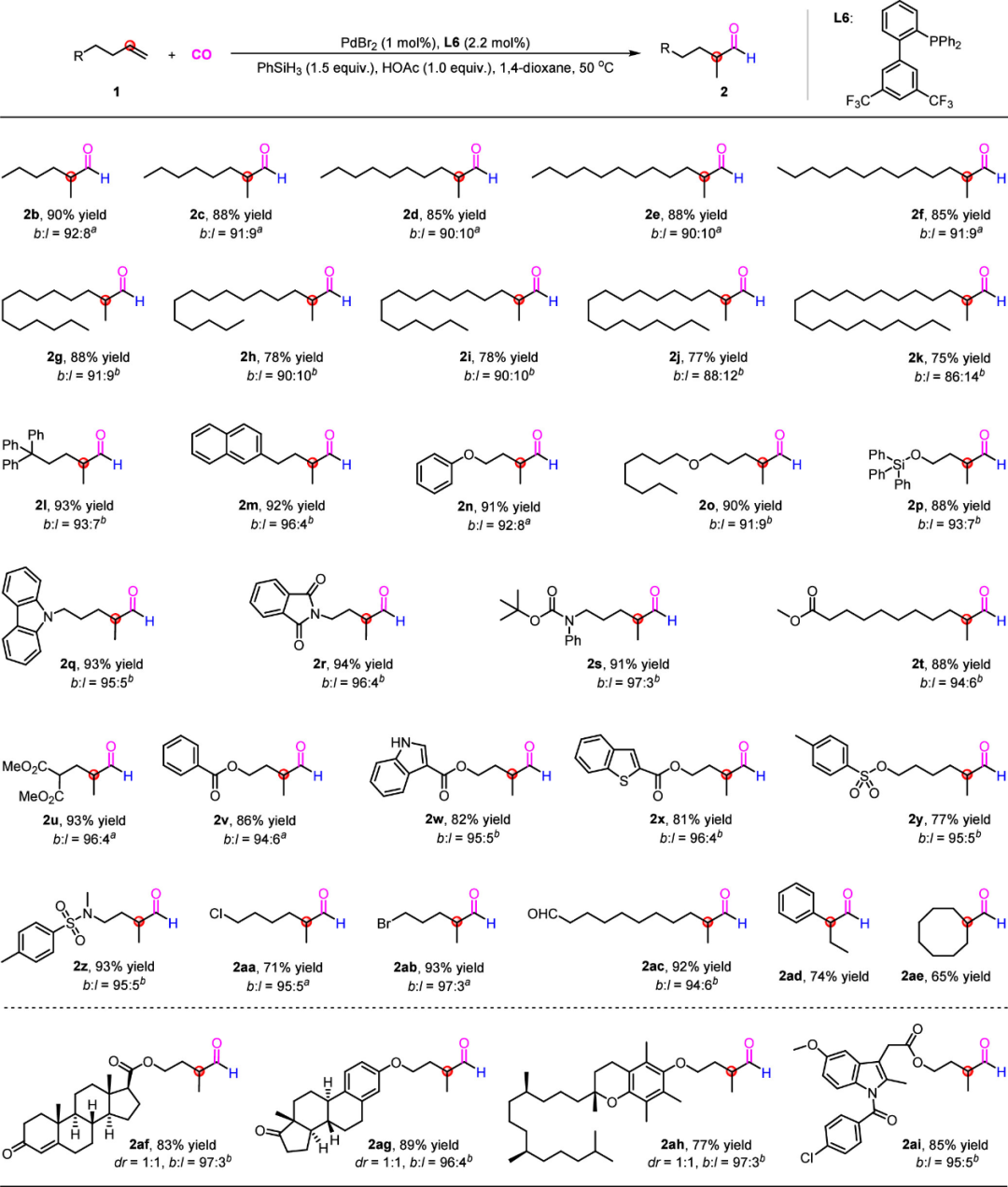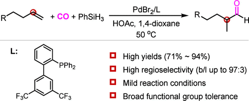 近日,必赢官网羰基化合成研究团队构建了一种钯催化烯烃的马氏氢甲酰化反应,成功突破传统烯烃氢甲酰化反应的区域选择性限制,实现了支链醛的高效合成。