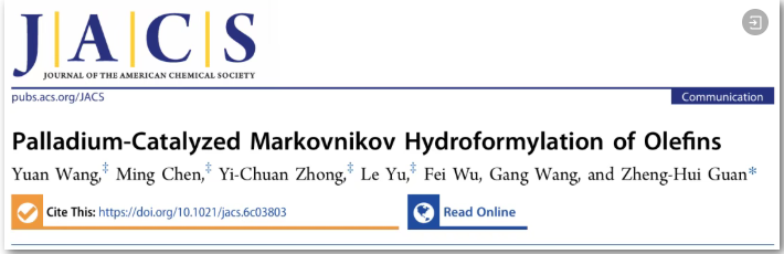 该成果以" Palladium-Catalyzed Markovnikov Hydroformylation of Olefins”为题发表在《美国化学会志》(JACS)上,437ccm·必赢国际毕业硕士生王圆、副教授陈明、博士生钟绎川和副教授于乐为论文共同第一作者,通讯作者为关正辉教授。