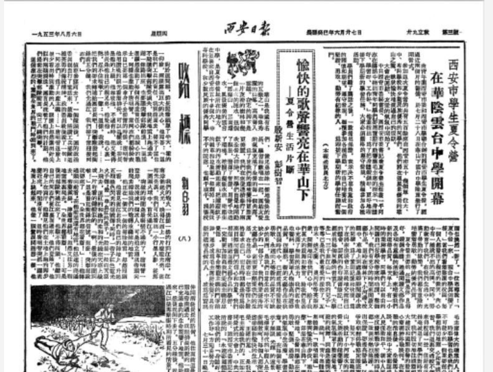 1953年8月6日《西安日报》刊登彭树智先生《愉快的歌声响亮在华山下》稿件。 (资料图片)
