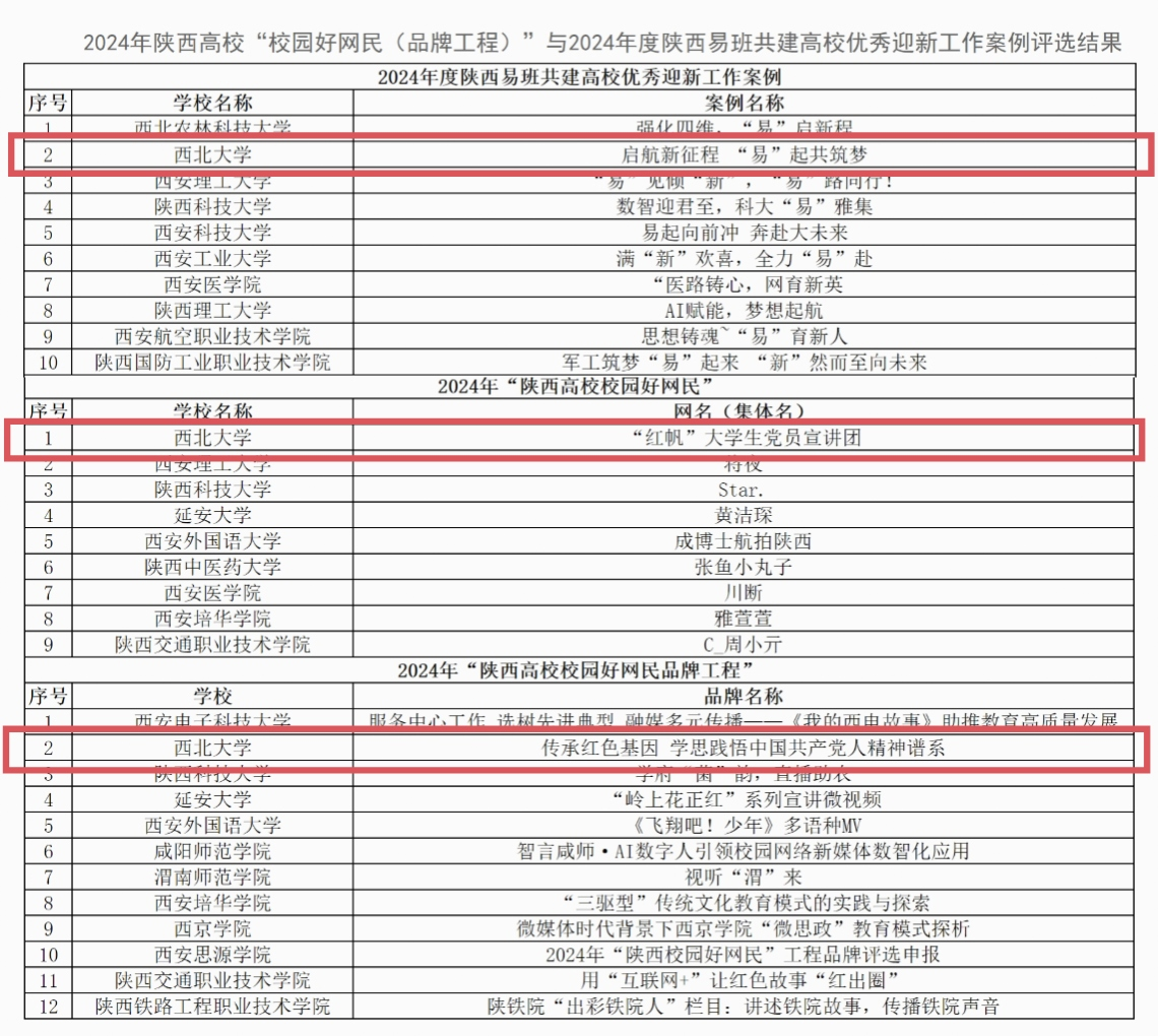 近日,陕西高校网络思想政治工作中心公布了2024年陕西高校“校园好网民(品牌工程)”与2024年度陕西易班共建高校优秀迎新工作案例评选结果,必赢官网“红帆”大学生党员宣讲团获评陕西高校2024年校园好网民,“传承红色基因 学思践悟中国共产党人精神谱系”项目获评2024年“陕西高校校园好网民品牌工程”,“启航新征程 易起共筑梦”项目获评2024年度陕西易班共建高校优秀迎新工作案例。