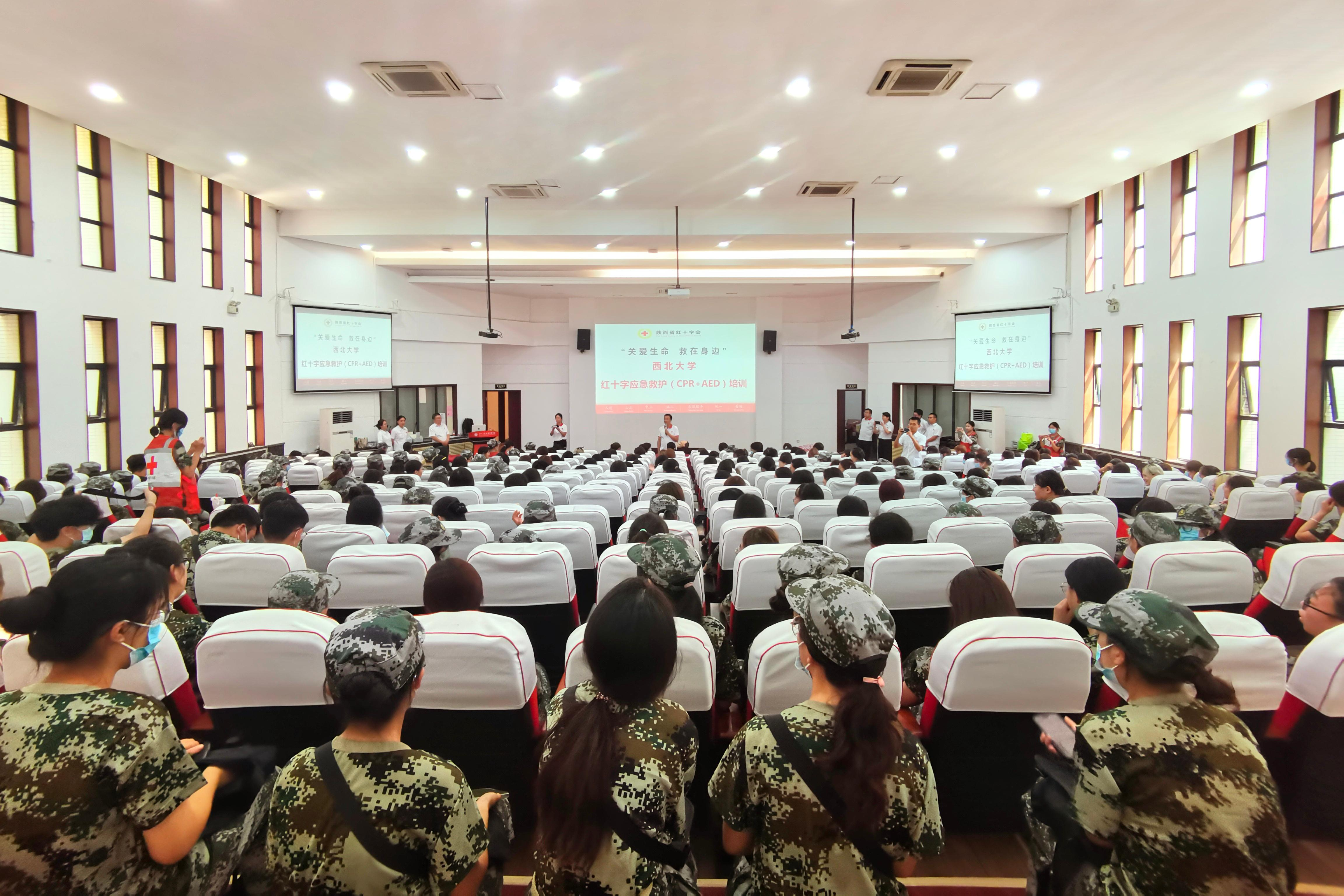 培训在陕西省红十字会应急救护专业讲师的自我介绍中拉开帷幕,他们以“呼救专用手势”引入,采用“问题式导学”的方法,通过理论讲解和实际操作相结合的形式,将晦涩难懂的急救知识与技能“掰开揉碎”,深入浅出地讲解了心肺复苏(CPR)操作流程、自动体外除颤器(AED)使用方法及注意事项。实操环节中,同学们在实训老师的指导下不断梳理急救流程、规范动作要领,在情景演绎中沉浸式体验应急救护氛围,掌握心肺复苏技能。经过培训及考核,1200名本科新生获得陕西省红十字会颁发的“红十字救护员(初级)”证书。