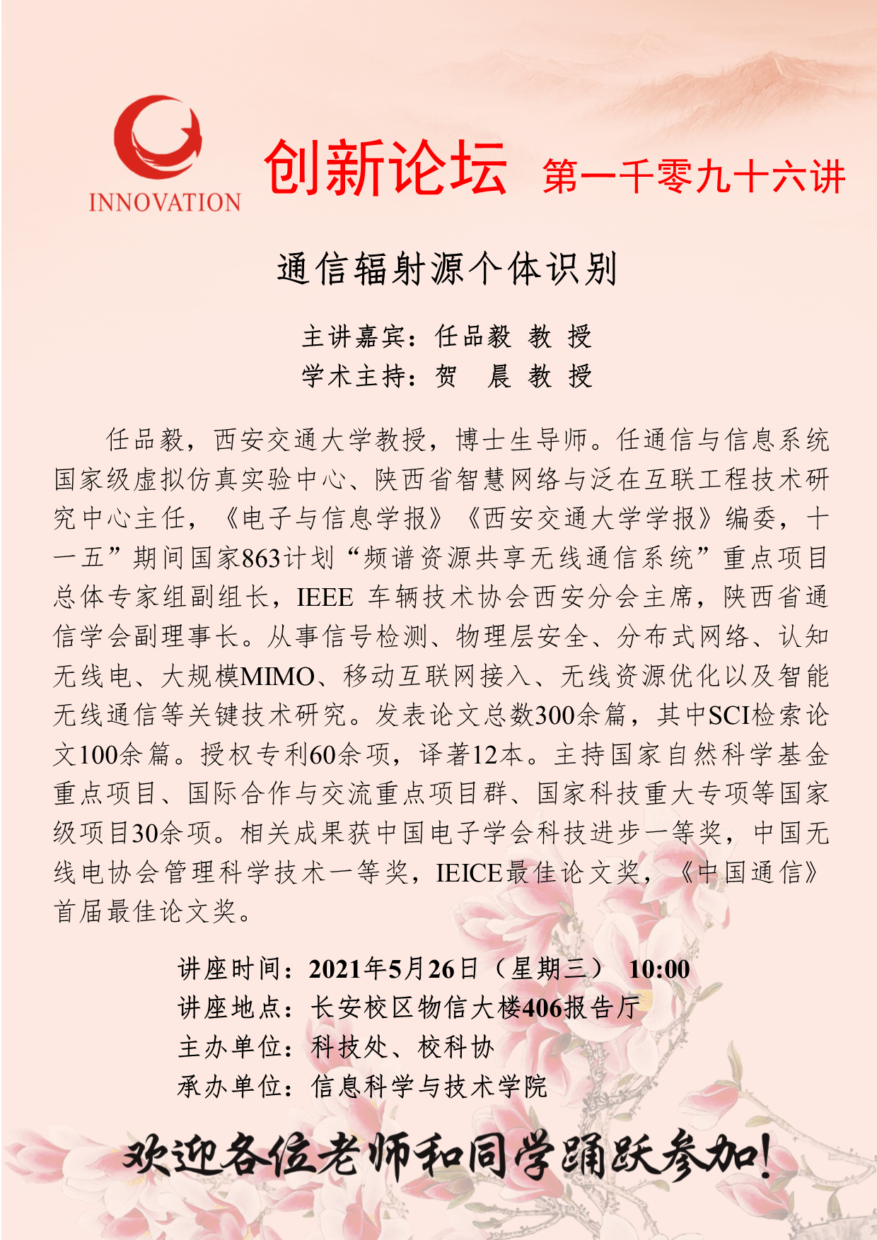 任品毅 教 授 437ccm·必赢国际创新论坛第一千零九十六讲:通信辐射源个体识别 讲座时间 2021年5月26日(星期三) 10:00 讲座地点 长安校区物信大楼406报告厅 讲座人介绍 任品毅 教 授 讲座内容
