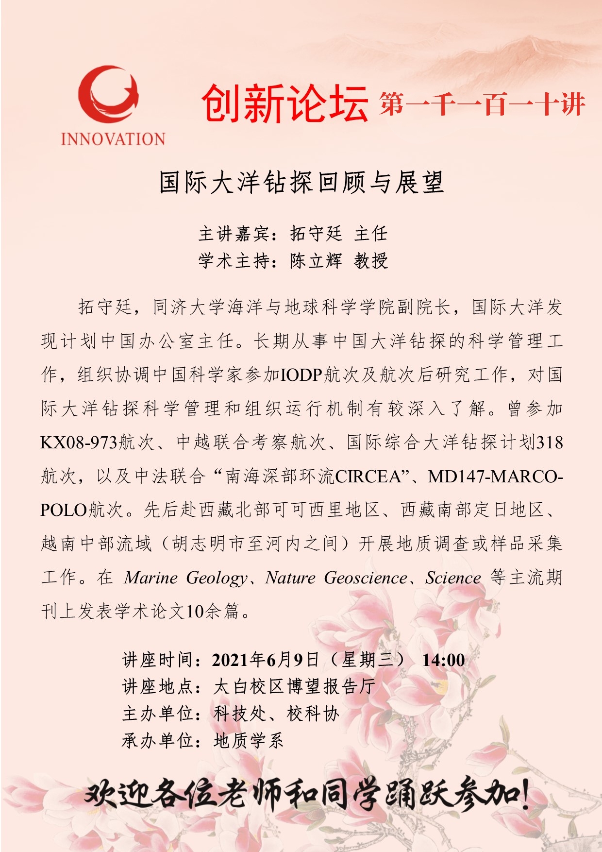 拓守廷 主任 437ccm·必赢国际创新论坛第一千一百一十讲:国际大洋钻探回顾与展望 讲座时间 2021年6月9日(星期三) 14:00 讲座地点 太白校区博望报告厅 讲座人介绍 拓守廷 主任 讲座内容