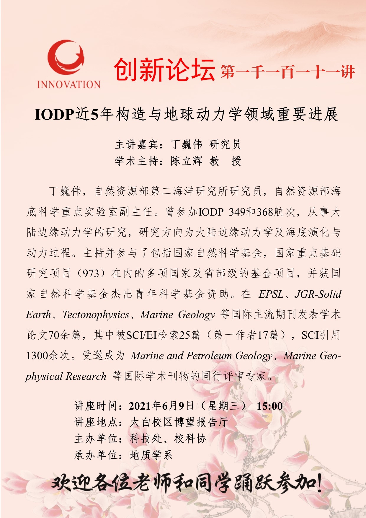 丁巍伟 研究员 437ccm·必赢国际创新论坛第一千一百一十一讲:IODP近5年构造与地球动力学领域重要进展 讲座时间 2021年6月9日(星期三) 15:00 讲座地点 太白校区博望报告厅 讲座人介绍 丁巍伟 研究员 讲座内容