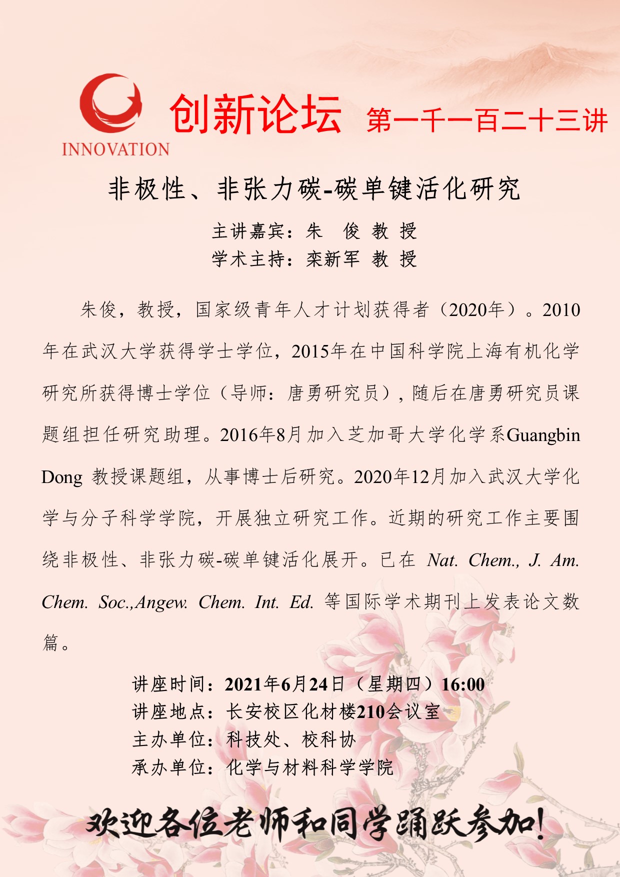 朱 俊 教 授 437ccm·必赢国际创新论坛第一千一百二十三讲:非极性、非张力碳-碳单键活化研究 讲座时间 2021年6月24日(星期四)16:00 讲座地点 长安校区化材楼210会议室 讲座人介绍 朱 俊 教 授 讲座内容