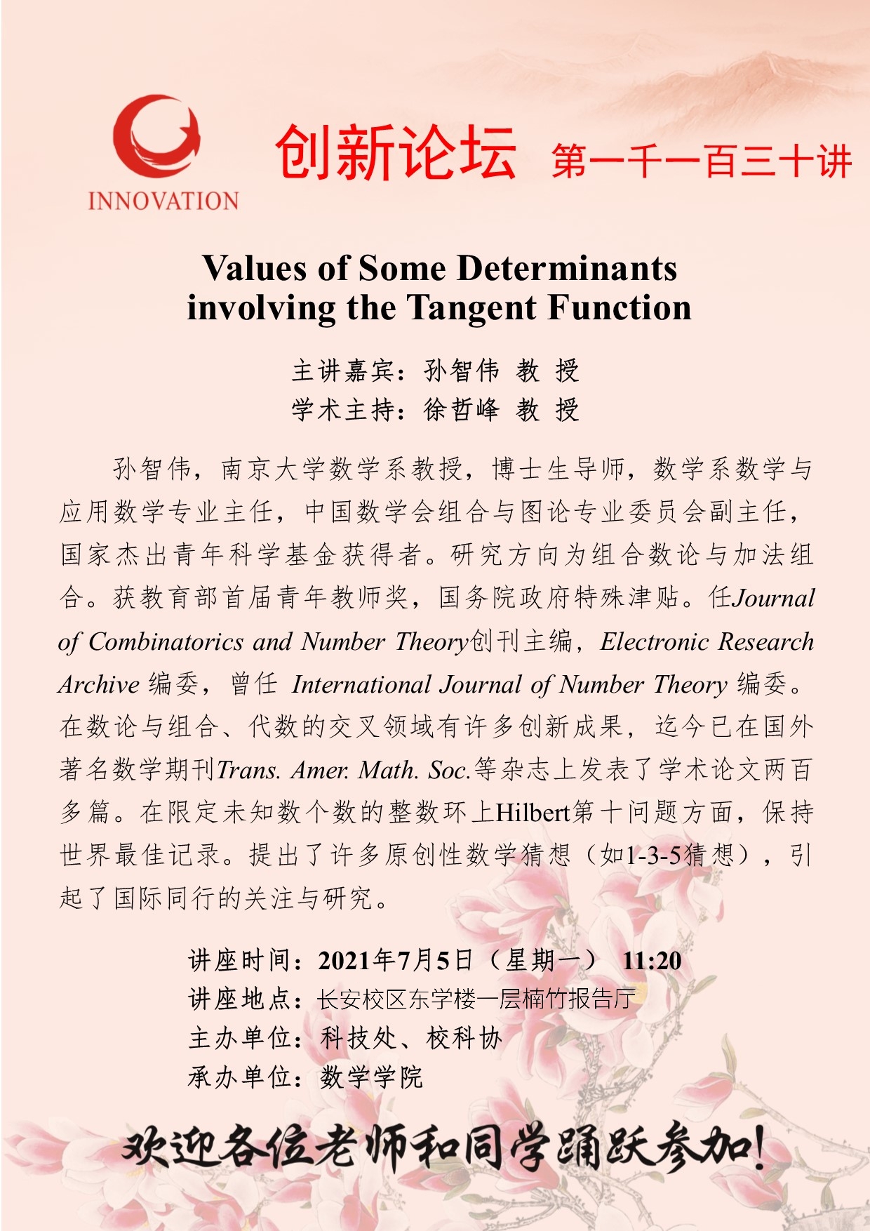 孙智伟 教 授 437ccm·必赢国际创新论坛第一千一百三十讲:Values of Some Determinants involving the Tangent Function 讲座时间 2021年7月5日(星期一) 11:20 讲座地点 长安校区东学楼一层楠竹报告厅 讲座人介绍 孙智伟 教 授 讲座内容