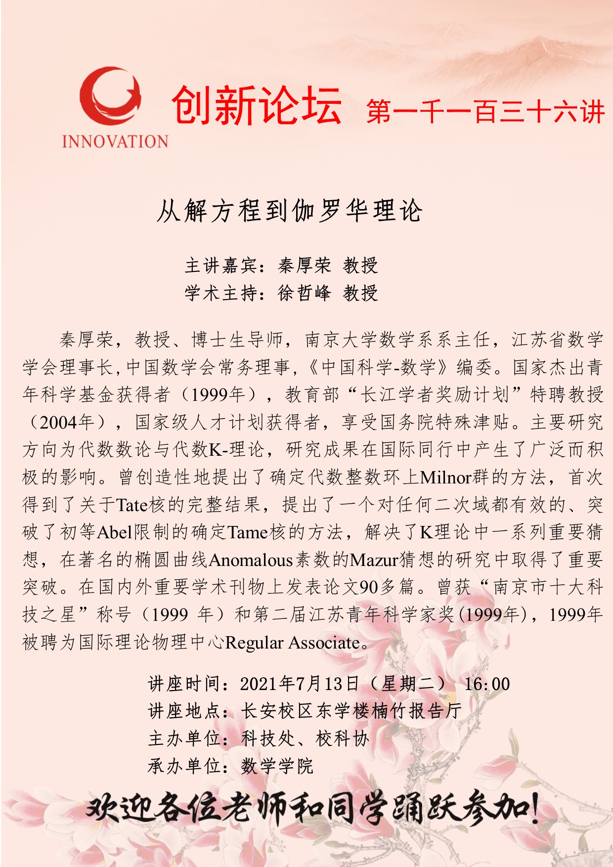 秦厚荣 教授 437ccm·必赢国际创新论坛第一千一百三十六讲:从解方程到伽罗华理论 讲座时间 2021年7月13日 (星期二)16:00 讲座地点 长安校区东学楼楠竹报告厅 讲座人介绍 秦厚荣 教授 讲座内容