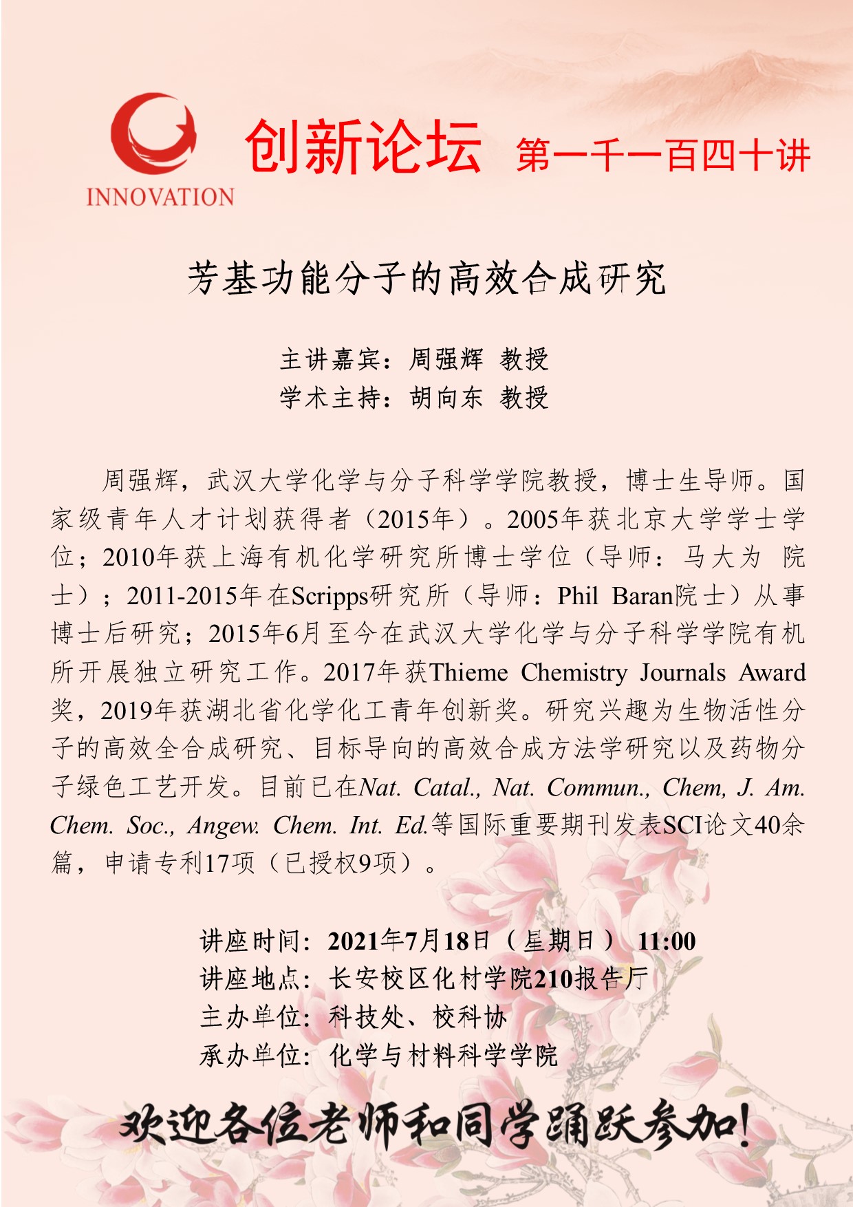周强辉 教授 437ccm·必赢国际创新论坛第一千一百四十讲:芳基功能分子的高效合成研究 讲座时间 2021年7月18日(星期日) 11:00 讲座地点 长安校区化材学院210报告厅 讲座人介绍 周强辉 教授 讲座内容
