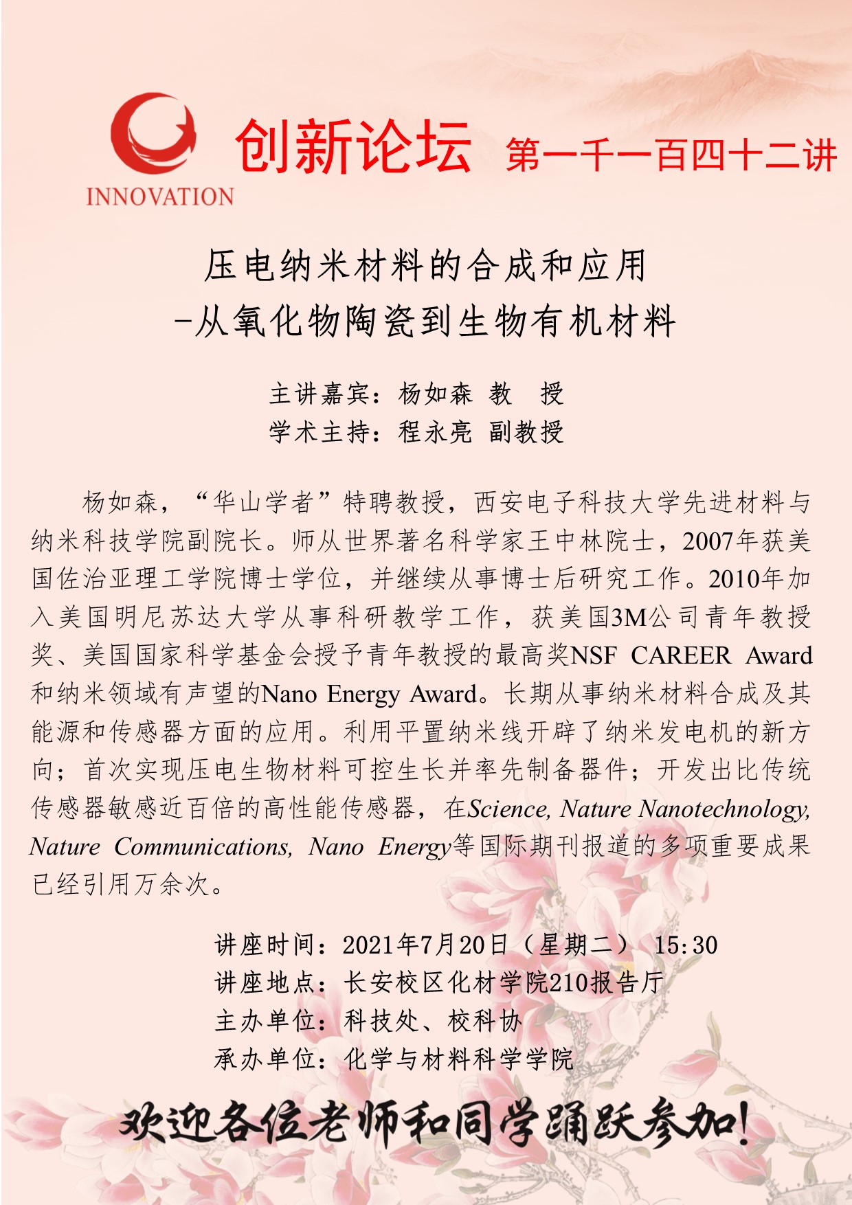 杨如森 教授 437ccm·必赢国际创新论坛第一千一百四十二讲:压电纳米材料的合成和应用-从氧化物陶瓷到生物有机材料 讲座时间 2021年7月20日(星期二) 15:30 讲座地点 长安校区化材学院210报告厅 讲座人介绍 杨如森 教授 讲座内容