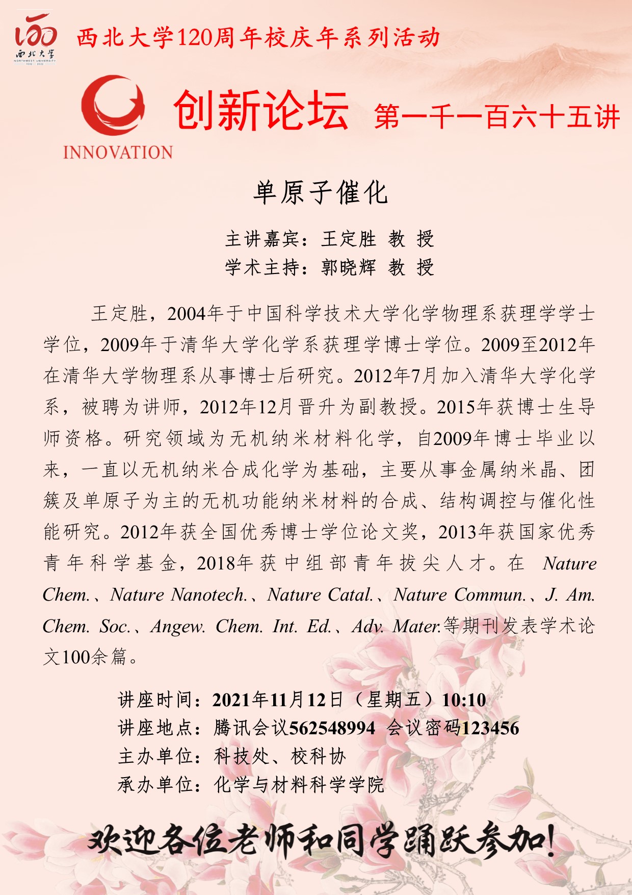 王定胜 教授 437ccm·必赢国际创新论坛第一千一百六十五讲暨120周年校庆年系列活动:单原子催化 讲座时间 2021年11月12日(星期五)10:10 讲座地点 腾讯会议562548994 会议密码123456 讲座人介绍 王定胜 教授 讲座内容