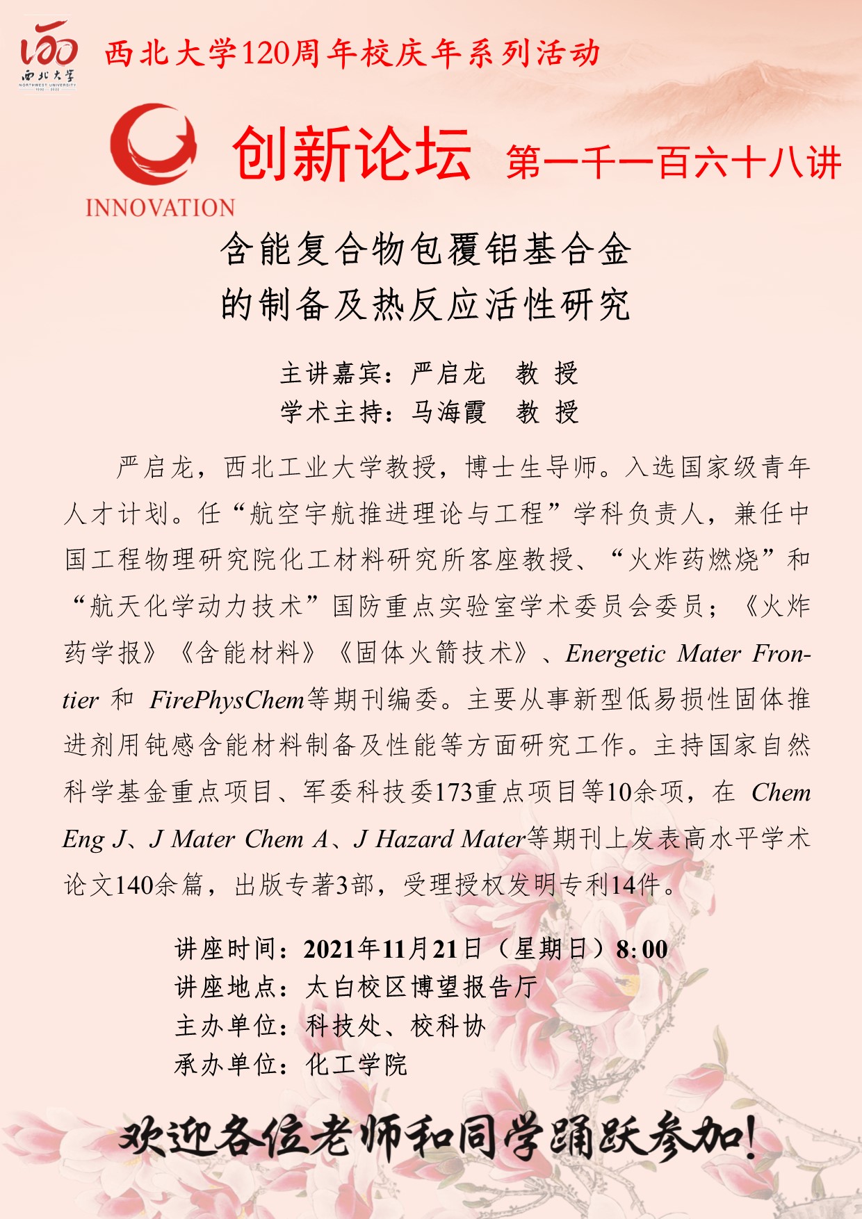 严启龙 教授 437ccm·必赢国际创新论坛第一千一百六十八讲暨120周年校庆年系列活动:含能复合物包覆铝基合金的制备及热反应活性研究 讲座时间 2021年11月21日(星期日)8:00 讲座地点 太白校区博望报告厅 讲座人介绍 严启龙 教授 讲座内容