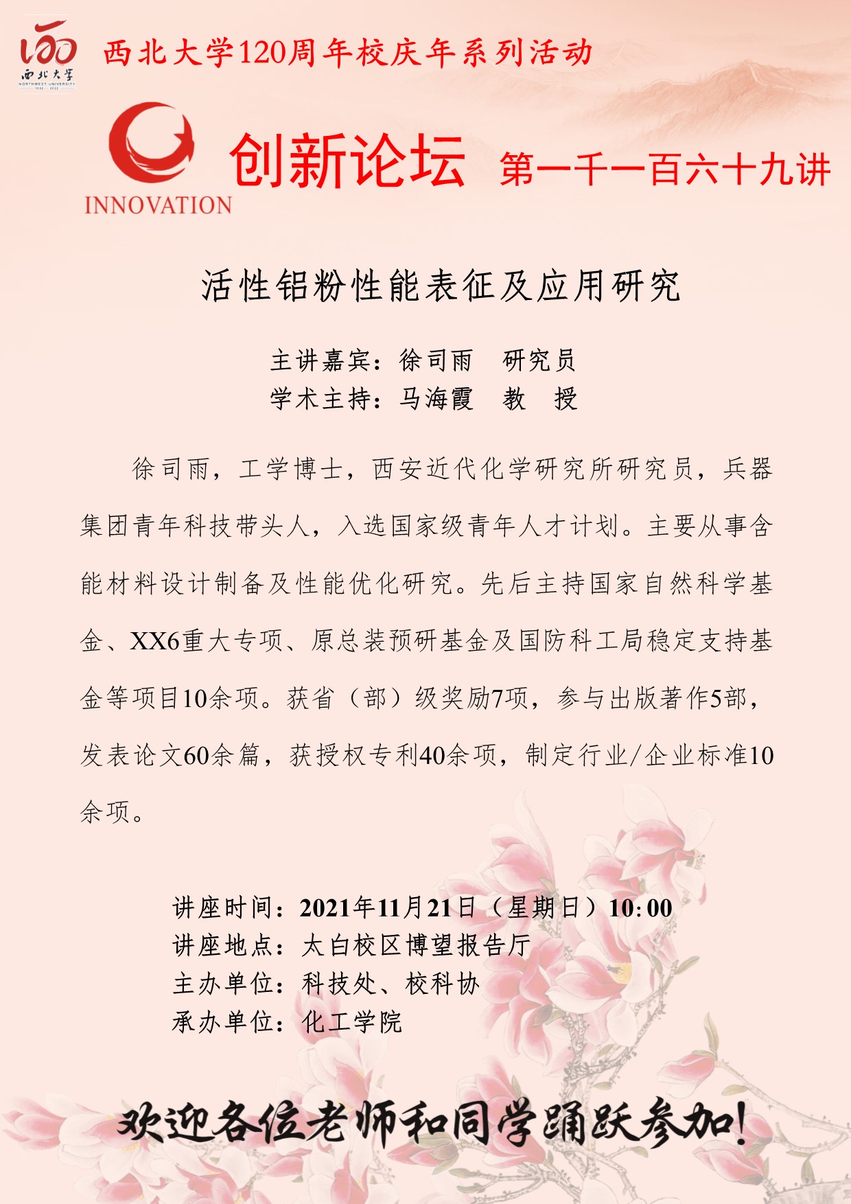 徐司雨 研究员 437ccm·必赢国际创新论坛第一千一百六十九讲暨120周年校庆年系列活动:活性铝粉性能表征及应用研究 讲座时间 2021年11月21日(星期日)10:00 讲座地点 太白校区博望报告厅 讲座人介绍 徐司雨 研究员 讲座内容