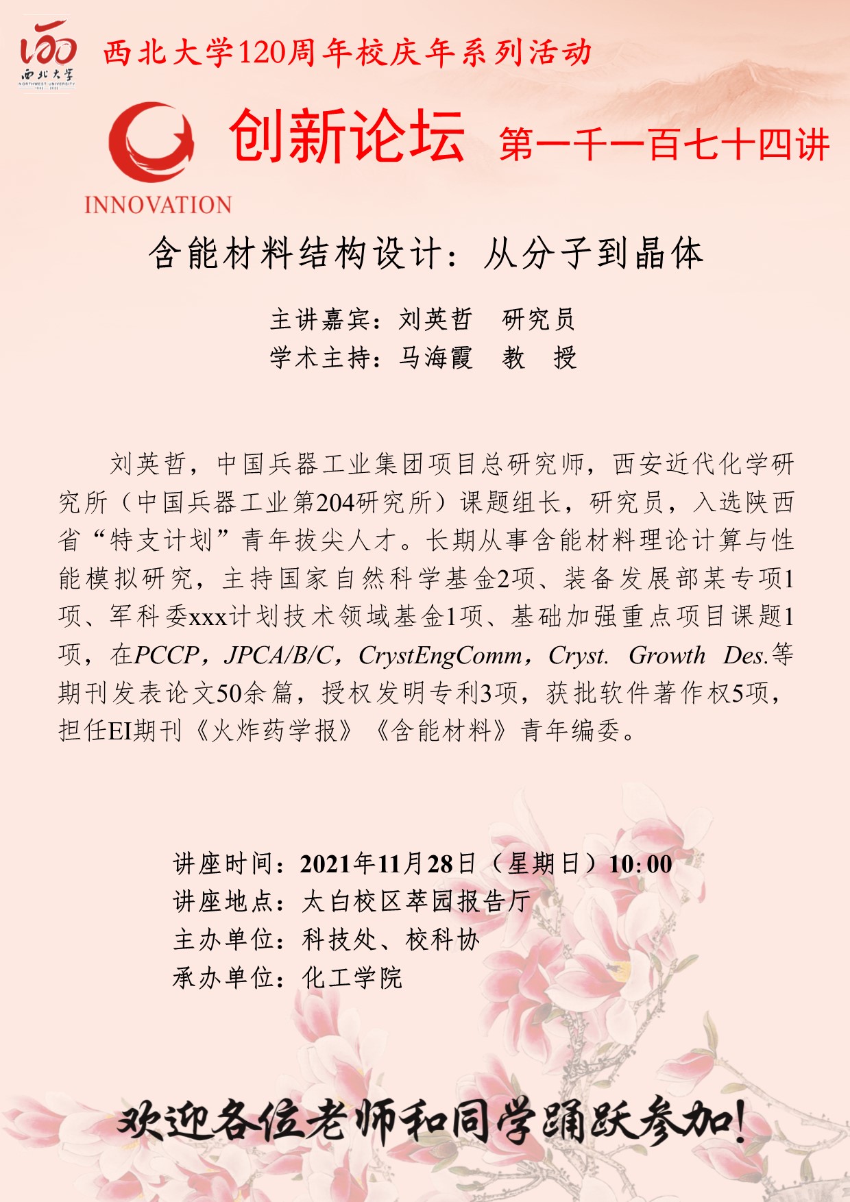 刘英哲 研究员 437ccm·必赢国际创新论坛第一千一百七十四讲暨120周年校庆年系列活动:含能材料结构设计: 从分子到晶体 讲座时间 2021年11月28日(星期日)10:00 讲座地点 太白校区萃园报告厅 讲座人介绍 刘英哲 研究员 讲座内容