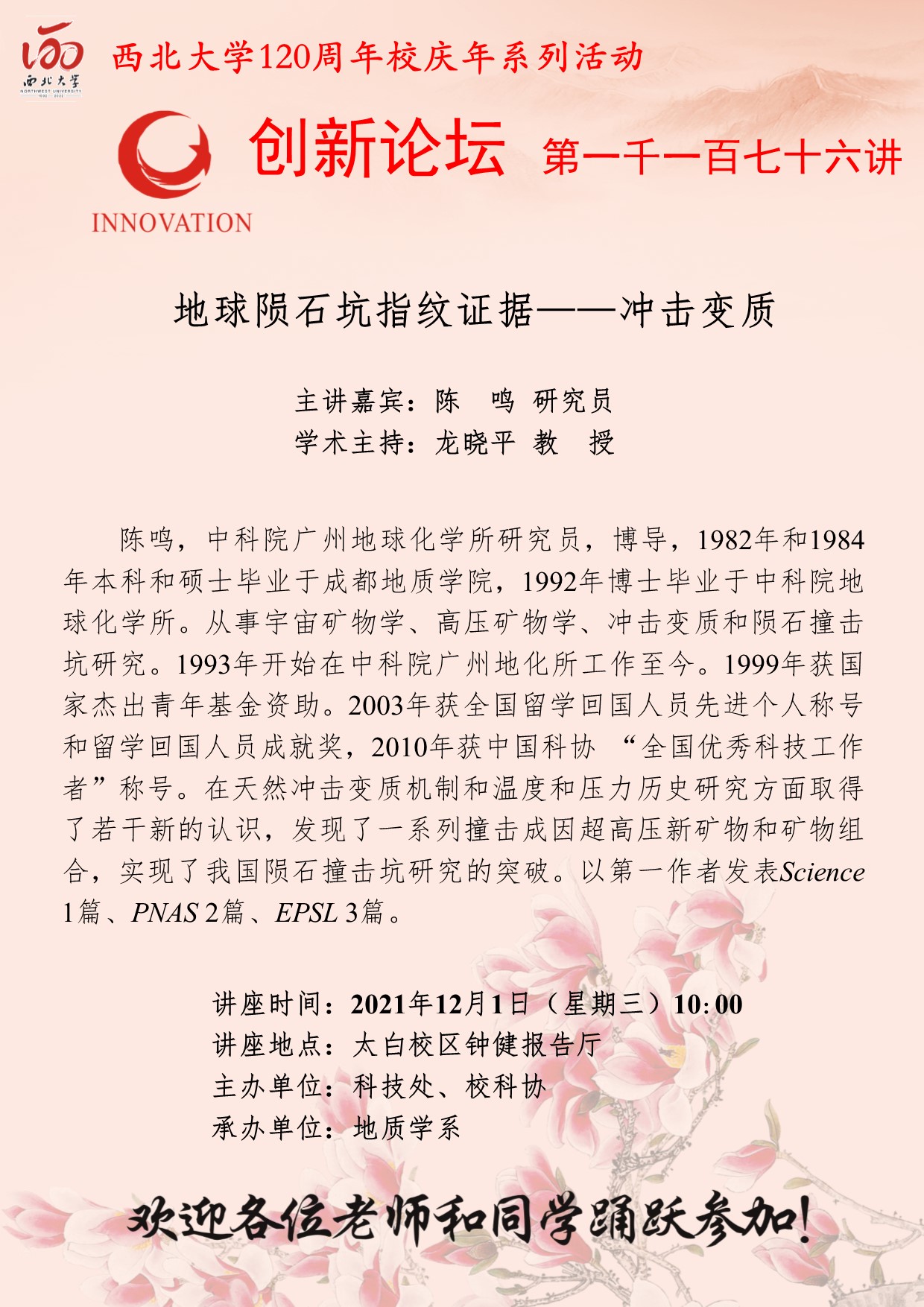 陈鸣 研究员 437ccm·必赢国际创新论坛第一千一百七十六讲暨120周年校庆年系列活动:地球陨石坑指纹证据——冲击变质 讲座时间 2021年12月1日(星期三)10:00 讲座地点 太白校区钟健报告厅 讲座人介绍 陈鸣 研究员 讲座内容