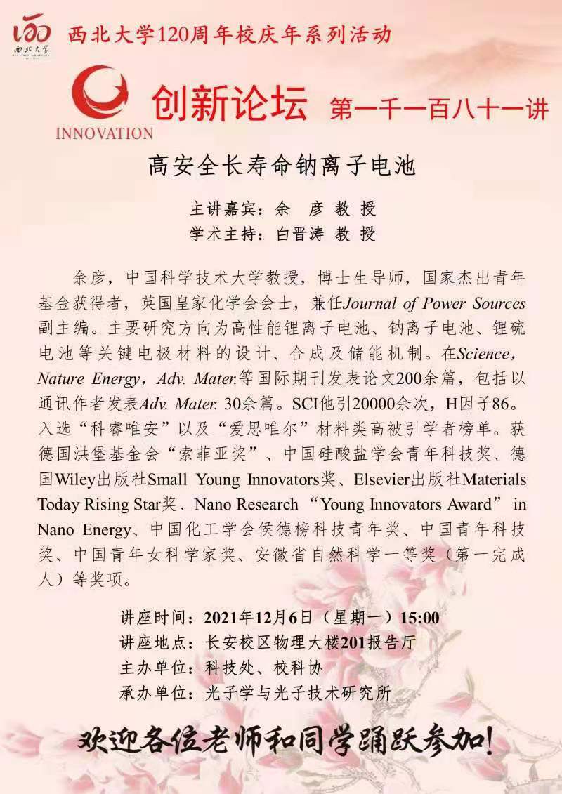 余彦 教授 437ccm·必赢国际创新论坛第一千一百八十一讲暨120周年校庆年系列活动:高安全长寿命钠离子电池 讲座时间 2021年12月6日(星期一)15:00 讲座地点 长安校区物理大楼201报告厅 讲座人介绍 余彦 教授 讲座内容