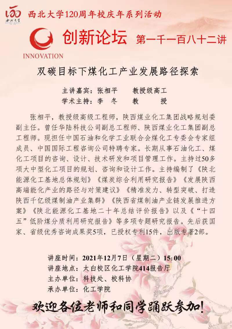 张相平 教授级高工 437ccm·必赢国际创新论坛第一千一百八十二讲暨120周年校庆年系列活动:双碳目标下煤化工产业发展路径探索 讲座时间 2021年12月7日(星期二)15:00 讲座地点 太白校区化工学院414报告厅 讲座人介绍 张相平 教授级高工 讲座内容