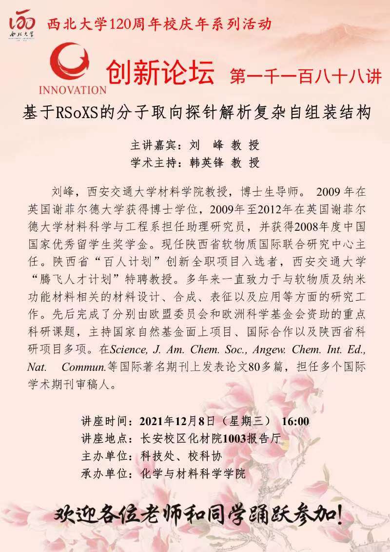 刘峰 教授 437ccm·必赢国际创新论坛第一千一百八十八讲暨120周年校庆年系列活动:基于RSoXS的分子取向探针解析复杂自组装结构 讲座时间 2021年12月8日(星期三) 16:00 讲座地点 长安校区化材院1003报告厅 讲座人介绍 刘峰 教授 讲座内容