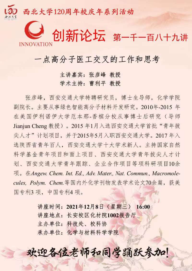 张彦峰 教授 437ccm·必赢国际创新论坛第一千一百八十九讲暨120周年校庆年系列活动:一点高分子医工交叉的工作和思考 讲座时间 2021年12月8日(星期三) 16:00 讲座地点 长安校区化材院1002报告厅 讲座人介绍 张彦峰 教授 讲座内容