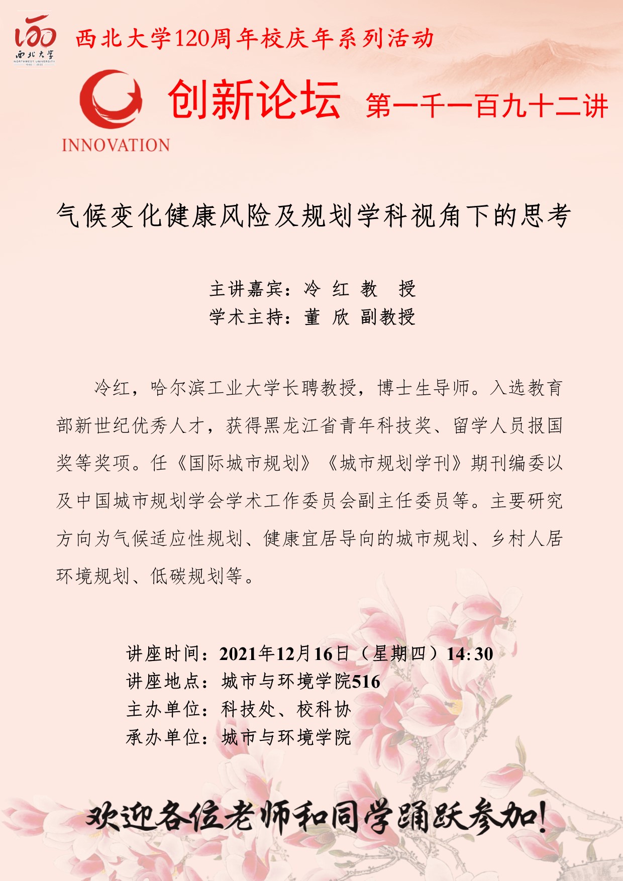 冷红 教授 437ccm·必赢国际创新论坛第一千一百九十二讲暨120周年校庆年系列活动:气候变化健康风险及规划学科视角下的思考 讲座时间 2021年12月16日(星期四)14:30 讲座地点 城市与环境学院516 讲座人介绍 冷红 教授 讲座内容