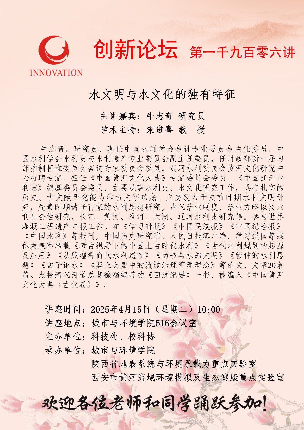 牛志奇 研究员 437ccm·必赢国际创新论坛第一千九百零六讲:水文明与水文化的独有特征 讲座时间 2025年4月15日(星期二)10:00 讲座地点 城市与环境学院516会议室 讲座人介绍 牛志奇 研究员 讲座内容