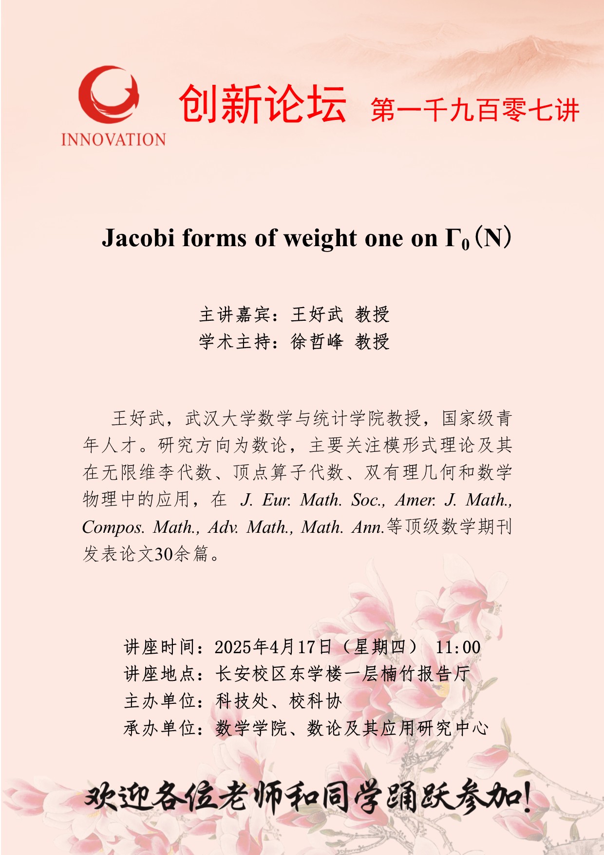 王好武 教授 437ccm·必赢国际创新论坛第一千九百零七讲:Jacobi forms of weight one on Γ0(N) 讲座时间 2025年4月17日(星期四) 11:00 讲座地点 长安校区东学楼一层楠竹报告厅 讲座人介绍 王好武 教授 讲座内容