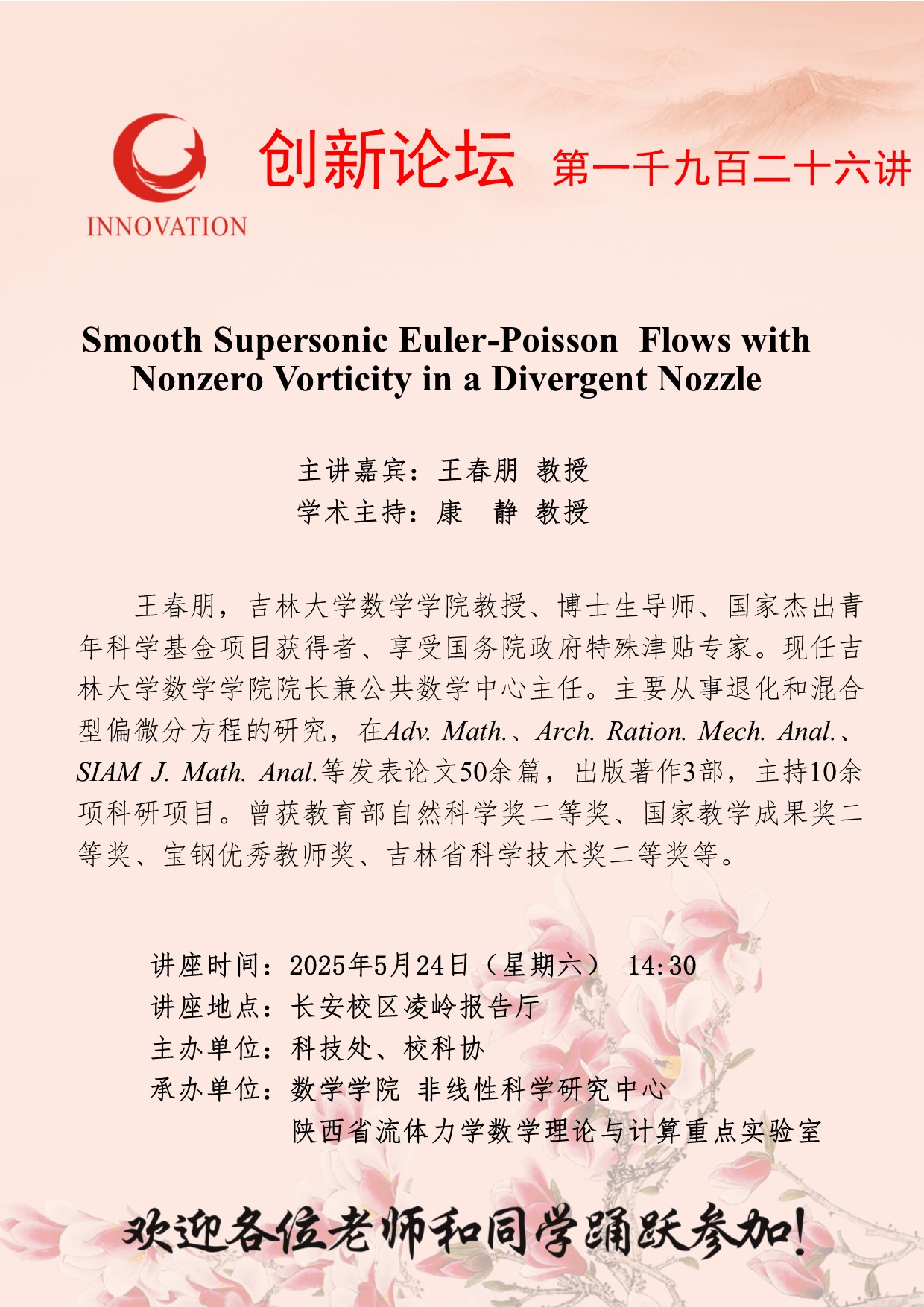 王春朋 教授 437ccm·必赢国际创新论坛第一千九百二十六讲:Smooth Supersonic Euler-Poisson Flows with Nonzero Vorticity in a Divergent Nozzle 讲座时间 2025年5月24日(星期六) 14:30 讲座地点 长安校区凌岭报告厅 讲座人介绍 王春朋 教授 讲座内容