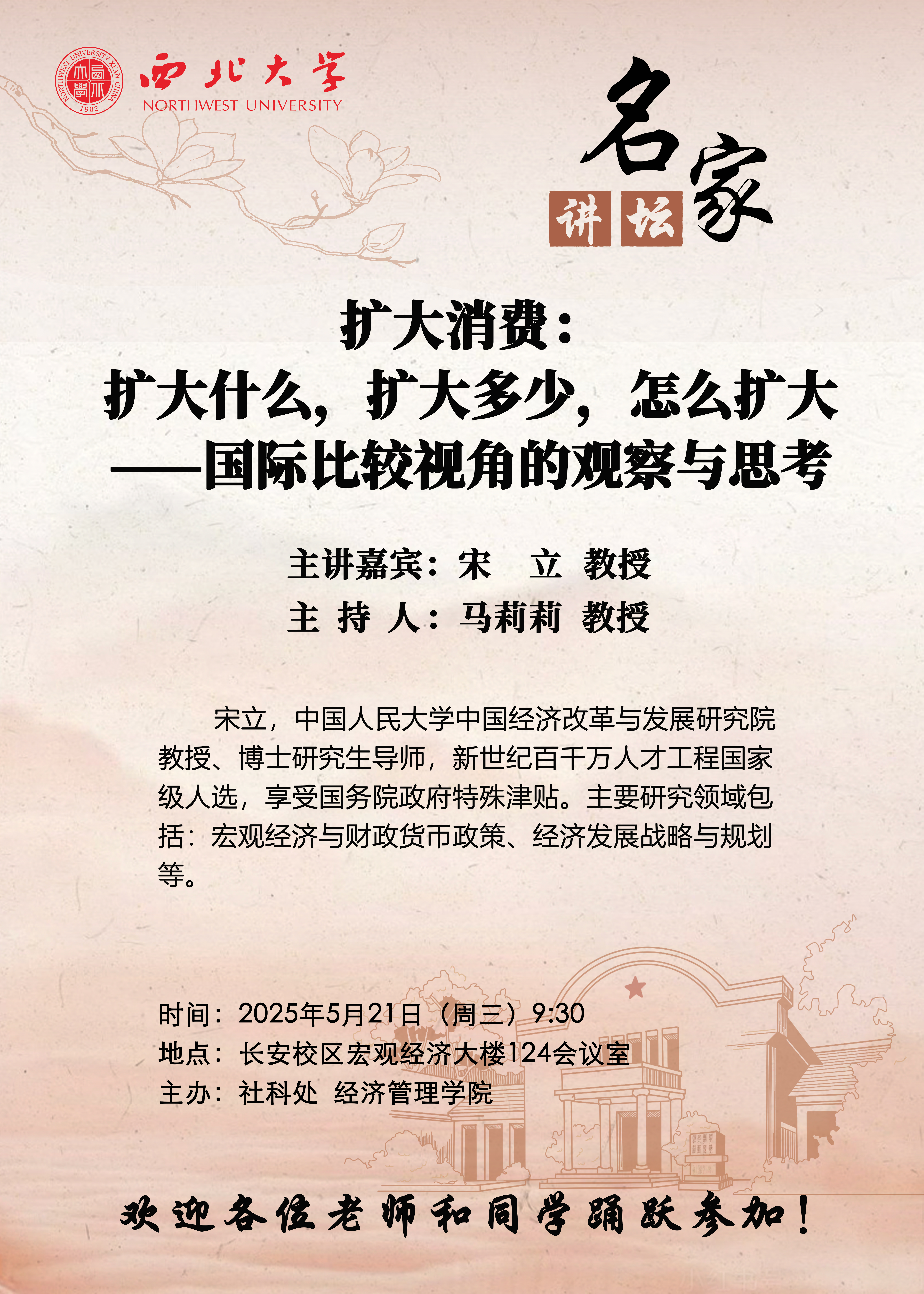 宋立 教授 名家讲坛:扩大消费:扩大什么,扩大多少,怎么扩大--国际比较视角的观察与思考 讲座时间 2025年5月21日(周三)9:30 讲座地点 长安校区宏观经济大楼124会议室 讲座人介绍 宋立 教授 讲座内容