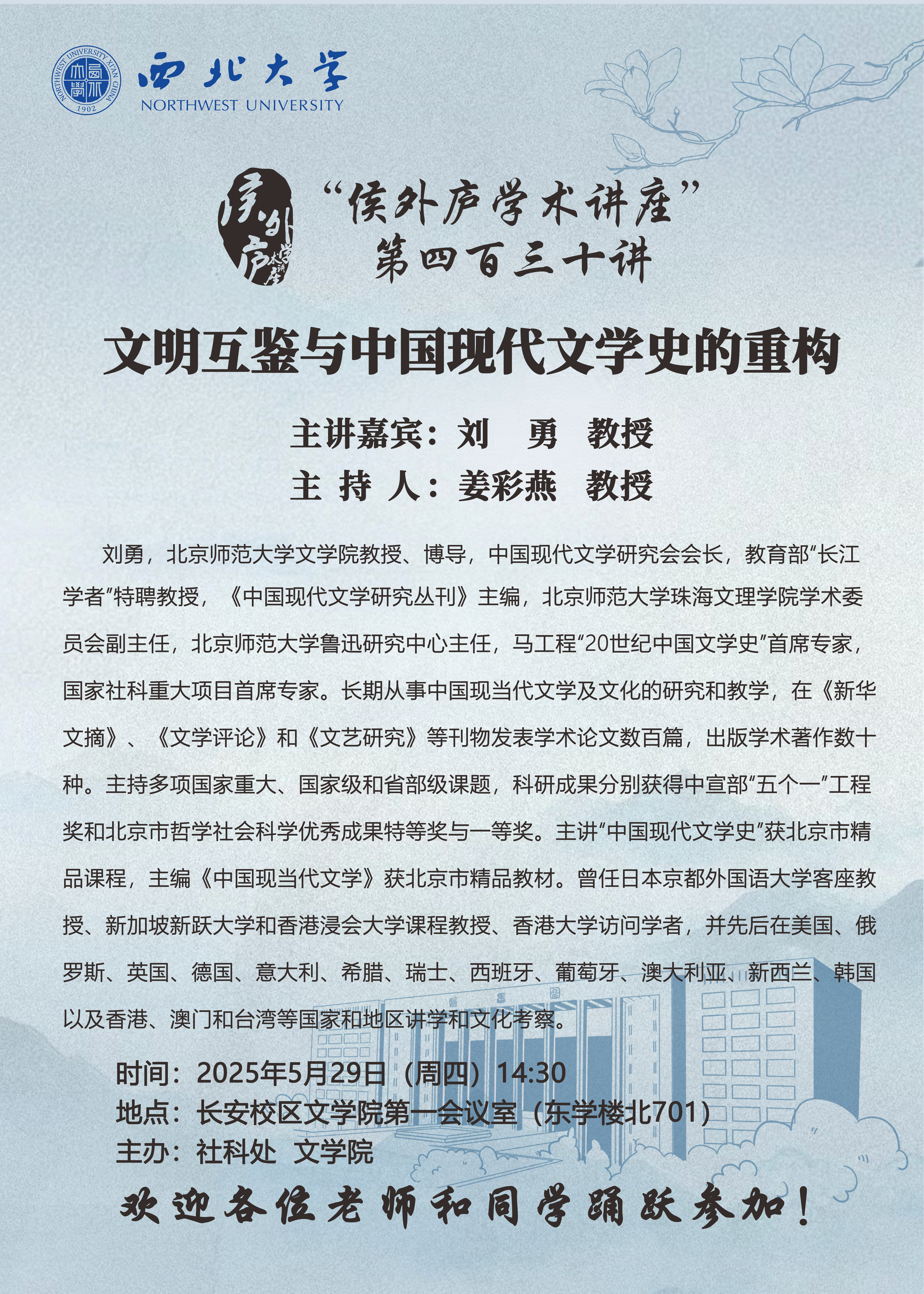 刘勇 教授 “侯外庐学术讲座”第四百三十讲:文明互鉴与中国现代文学史的重构 讲座时间 2025年5月29日(周四)14:30 讲座地点 文学院第一会议室(东学楼北701) 讲座人介绍 刘勇 教授 讲座内容