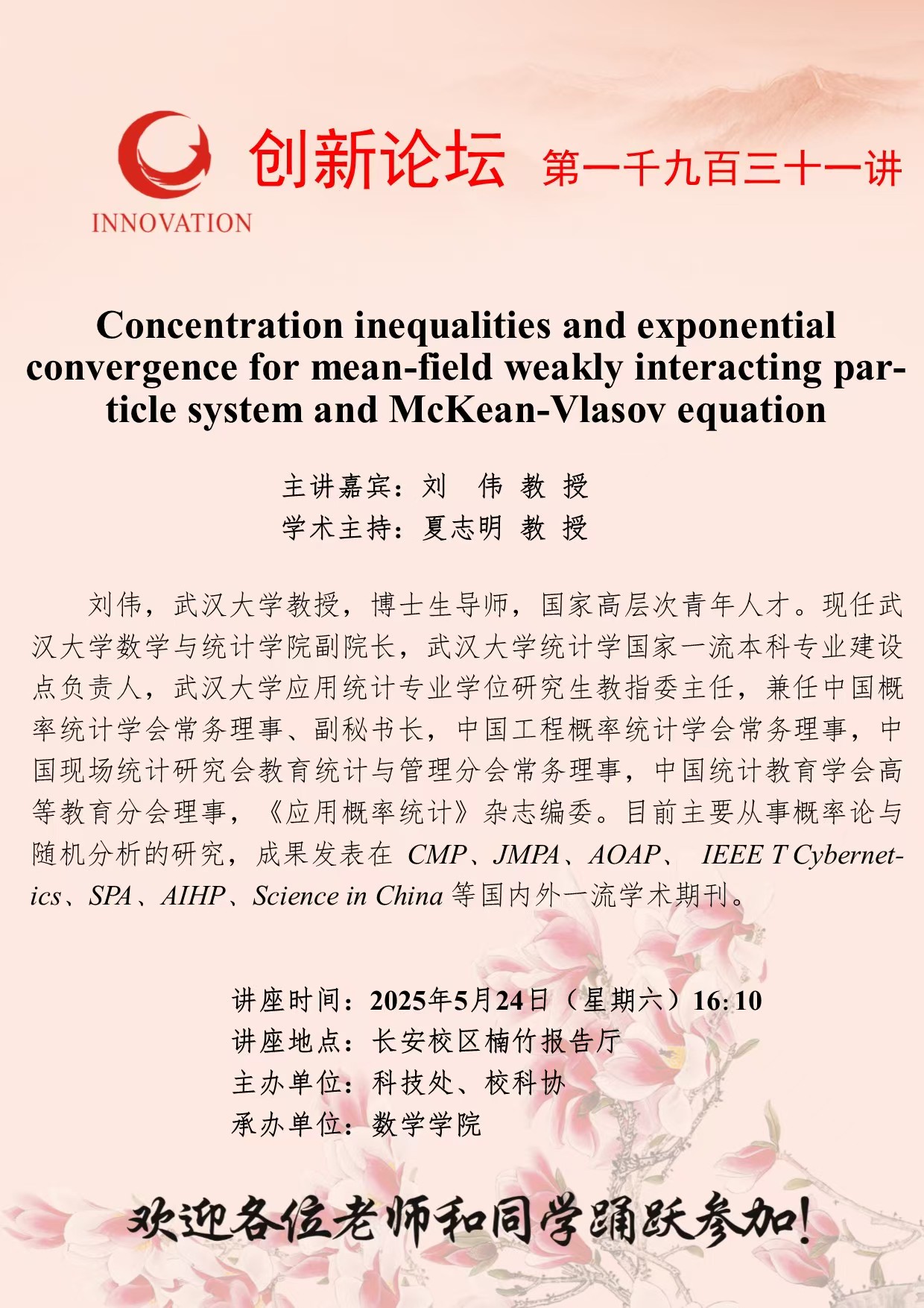 刘伟 教授 437ccm·必赢国际创新论坛第一千九百三十一讲:Concentration inequalities and exponential convergence for mean-field weakly interacting particle system and McKean-Vlasov equation 讲座时间 2025年5月24日(星期六)16:10 讲座地点 长安校区楠竹报告厅 讲座人介绍 刘伟 教授 讲座内容
