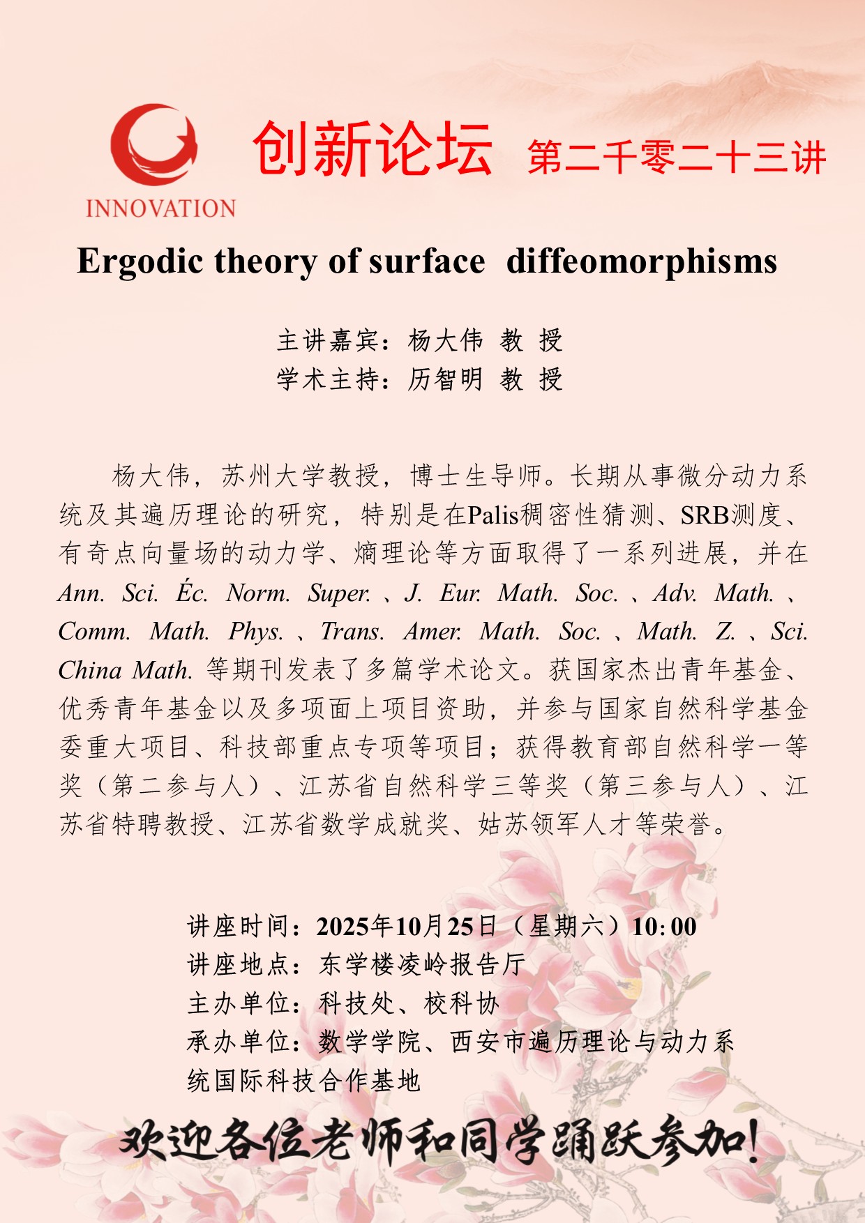 杨大伟 教 授 437ccm·必赢国际创新论坛第二千零二十三讲:Ergodic theory of surface diffeomorphisms 讲座时间 2025年10月25日(星期六)10:00 讲座地点 东学楼凌岭报告厅 讲座人介绍 杨大伟 教 授 讲座内容