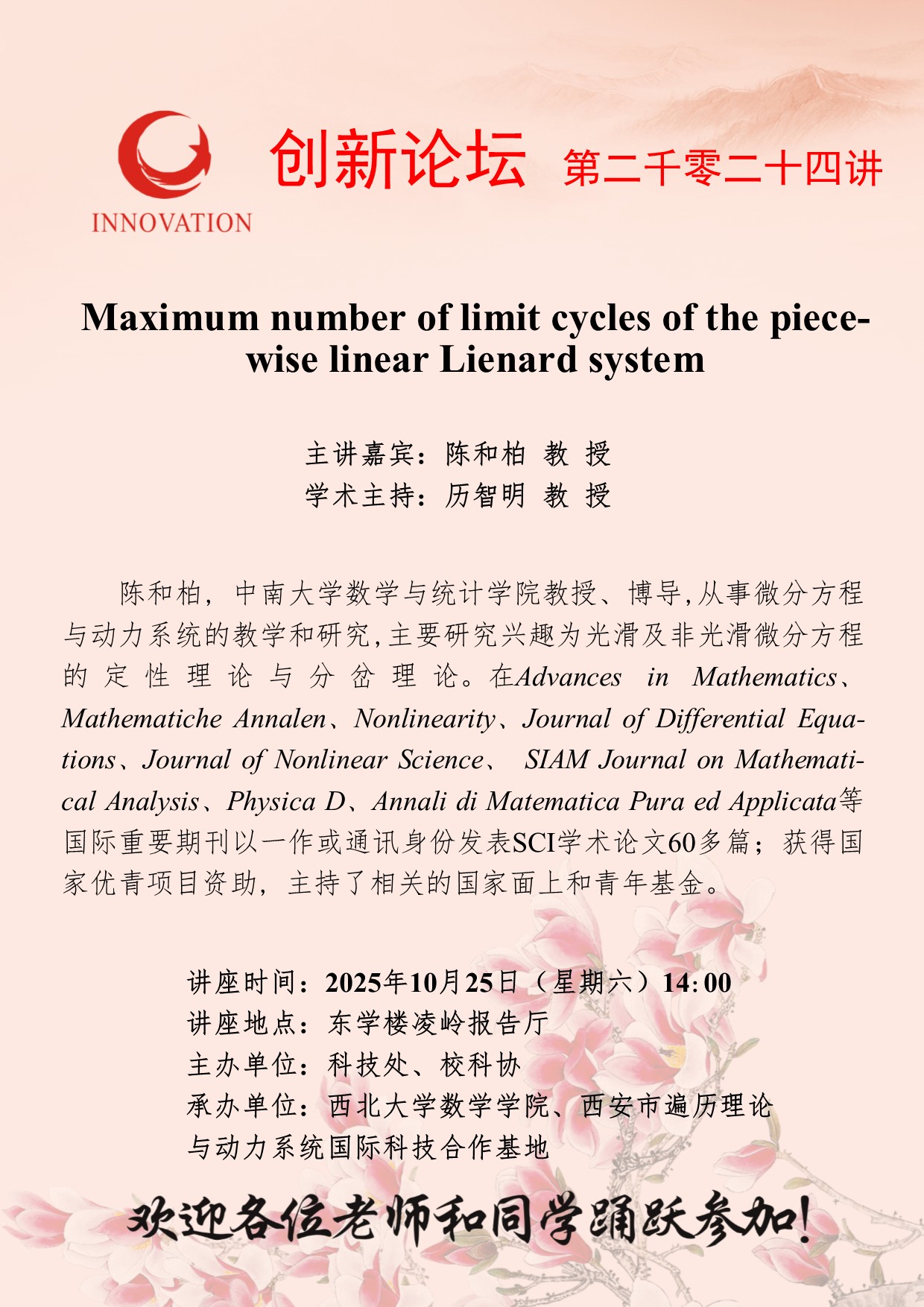陈和柏 教 授 437ccm·必赢国际创新论坛第二千零二十四讲:Maximum number of limit cycles of the piecewise linear Lienard system 讲座时间 2025年10月25日(星期六)14:00 讲座地点 东学楼凌岭报告厅 讲座人介绍 陈和柏 教 授 讲座内容
