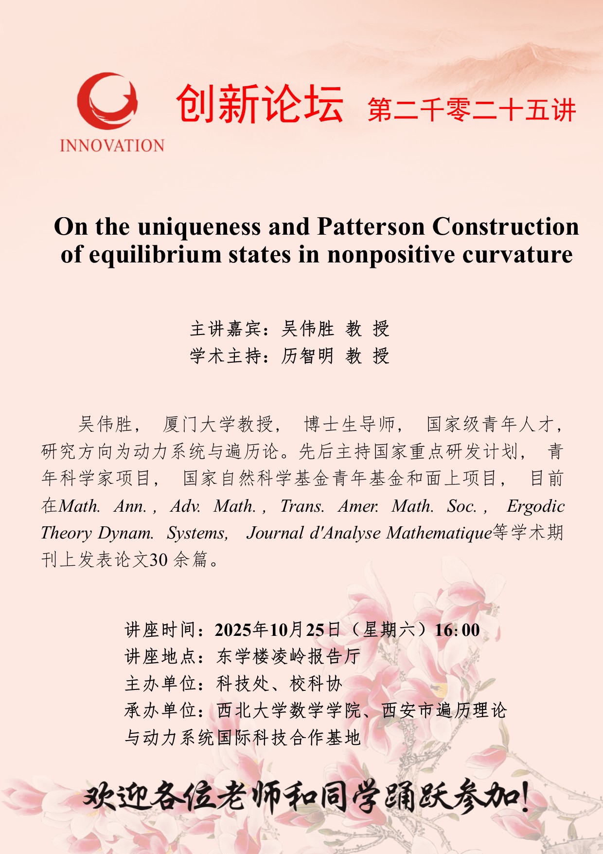 吴伟胜 教 授 437ccm·必赢国际创新论坛第二千零二十五讲:On the uniqueness and Patterson Construction of equilibrium states in nonpositive curvature 讲座时间 2025年10月25日(星期六)16:00 讲座地点 东学楼凌岭报告厅 讲座人介绍 吴伟胜 教 授 讲座内容