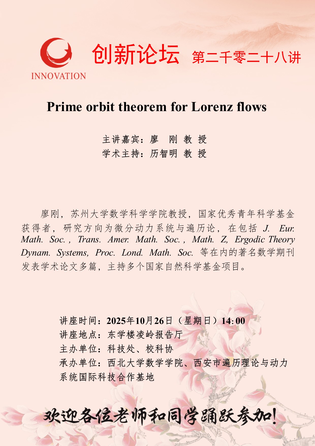 廖 刚 教 授 437ccm·必赢国际创新论坛第二千零二十八讲:Prime orbit theorem for Lorenz flows 讲座时间 2025年10月26日(星期日)14:00 讲座地点 东学楼凌岭报告厅 讲座人介绍 廖 刚 教 授 讲座内容