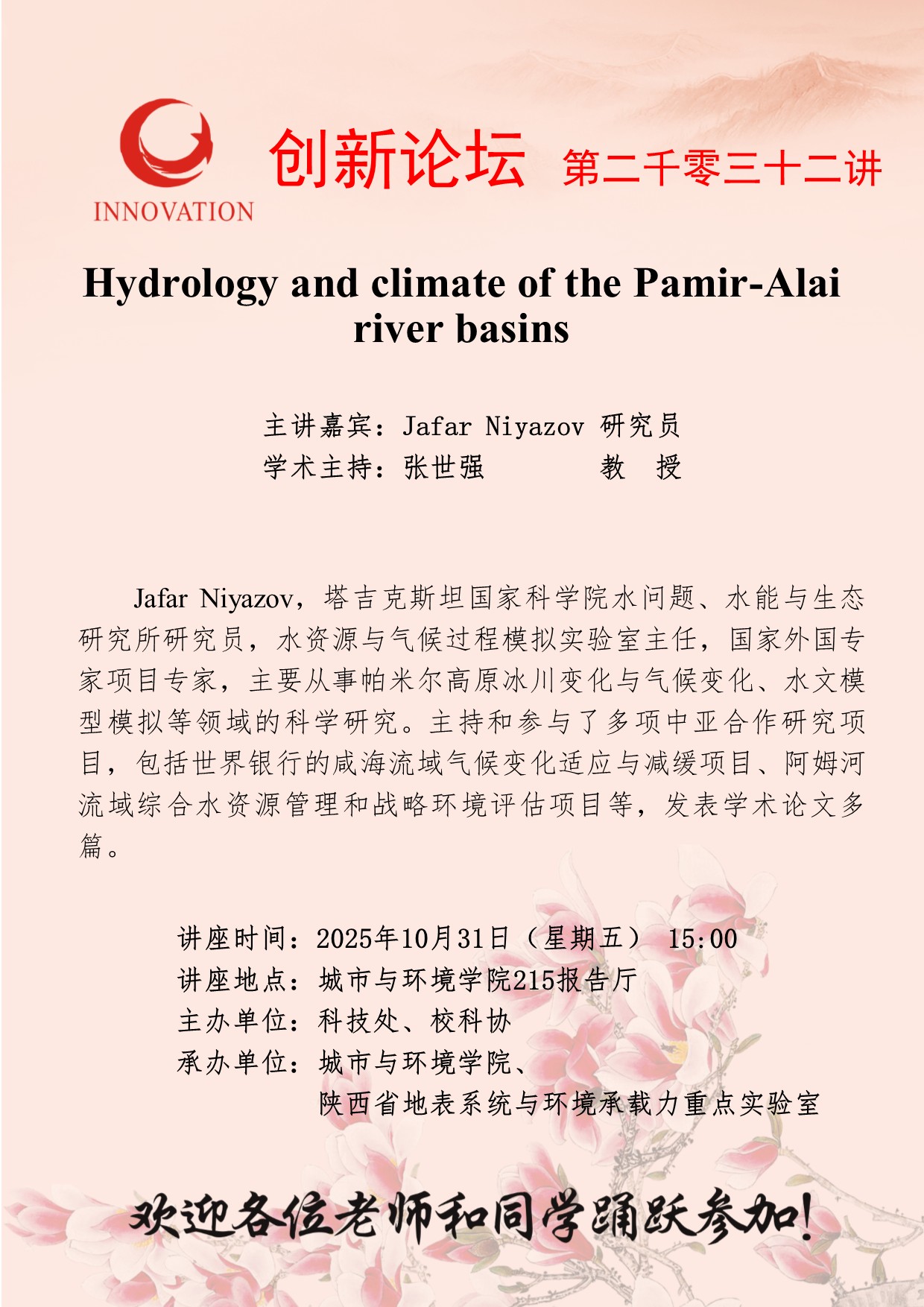 Jafar Niyazov 研究员 437ccm·必赢国际创新论坛第二千零三十二讲:Hydrology and climate of the Pamir-Alai river basins 讲座时间 2025年10月31日(星期五) 15:00 讲座地点 城市与环境学院215报告厅 讲座人介绍 Jafar Niyazov 研究员 讲座内容