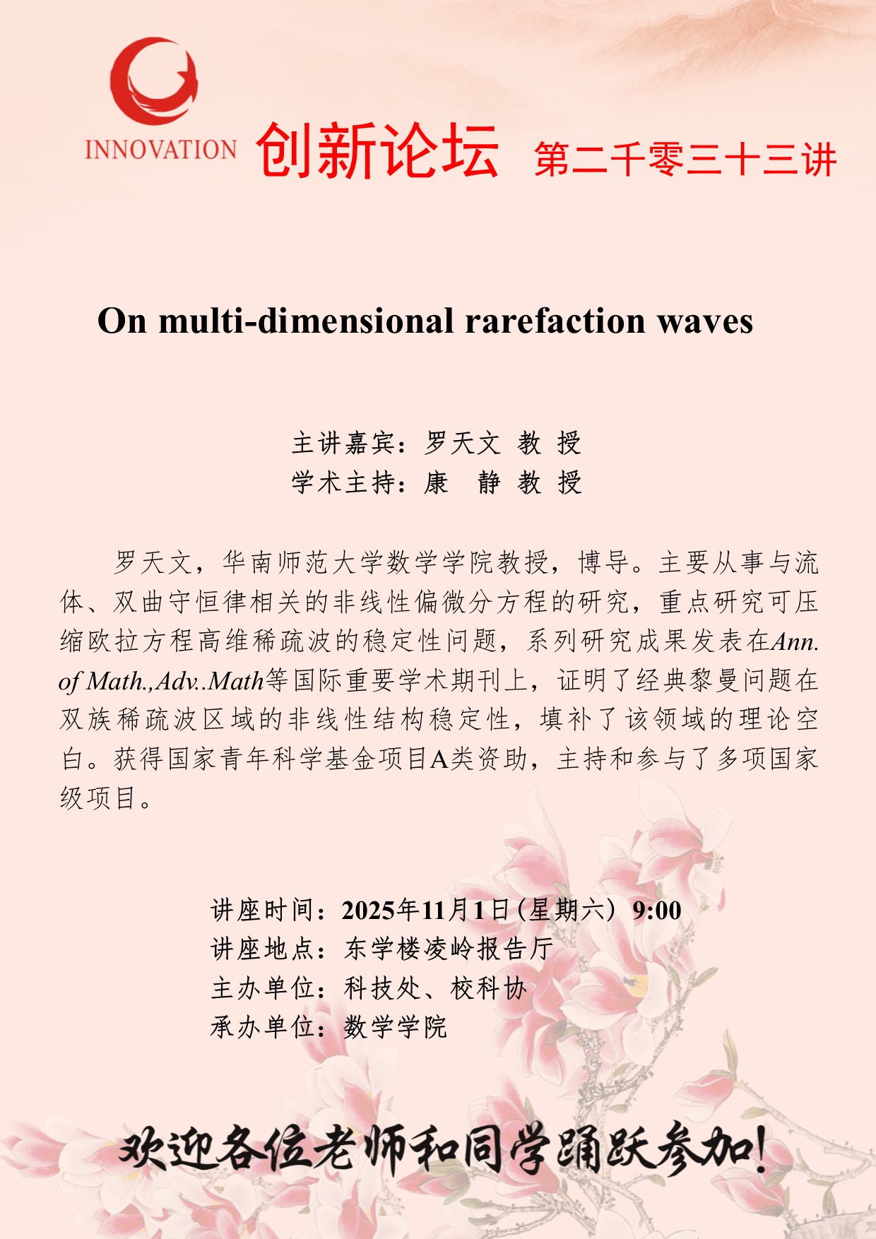 罗天文 教 授 437ccm·必赢国际创新论坛第二千零三十三讲:On multi-dimensional rarefaction waves 讲座时间 2025年11月1日(星期六) 9:00 讲座地点 东学楼凌岭报告厅 讲座人介绍 罗天文 教 授 讲座内容