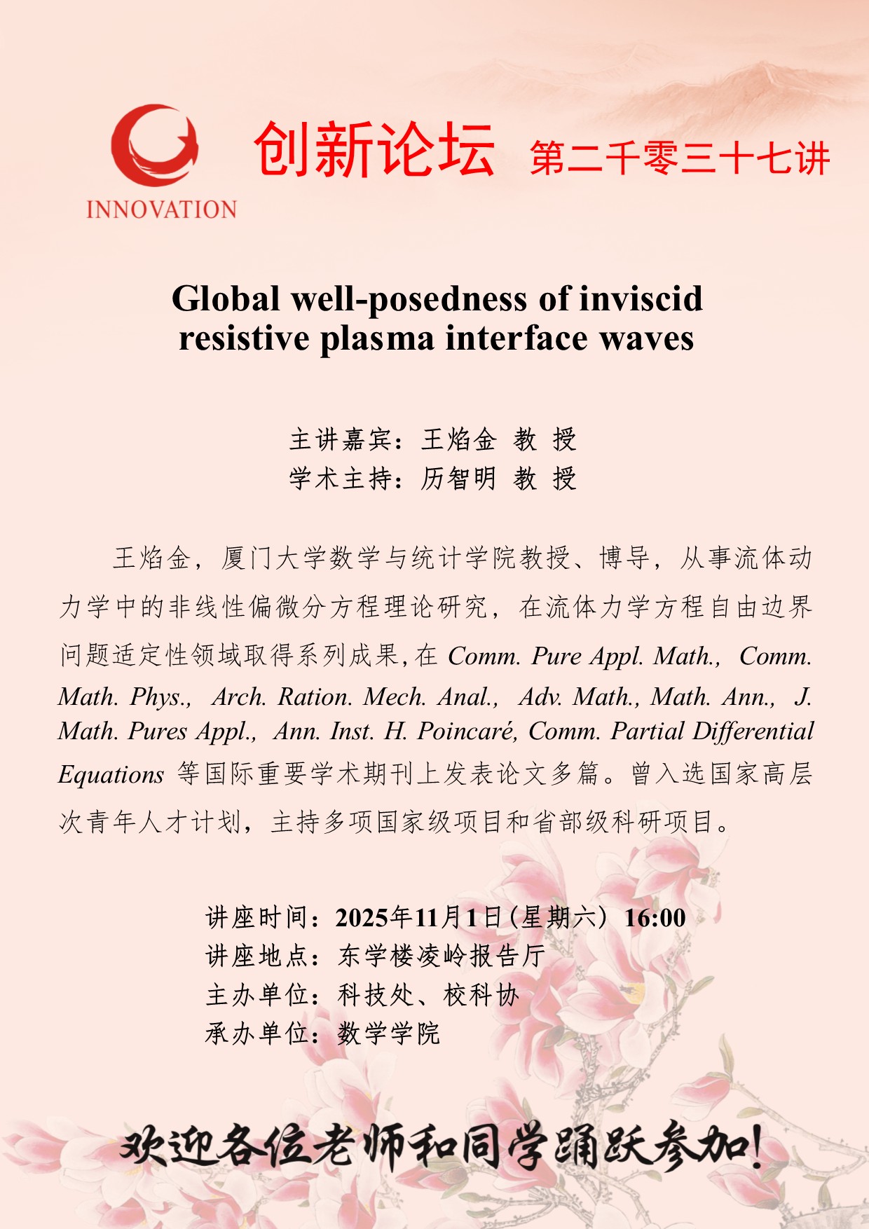王焰金 教 授 437ccm·必赢国际创新论坛第二千零三十七讲:Global well-posedness of inviscid resistive plasma interface waves 讲座时间 2025年11月1日(星期六) 16:00 讲座地点 东学楼凌岭报告厅 讲座人介绍 王焰金 教 授 讲座内容