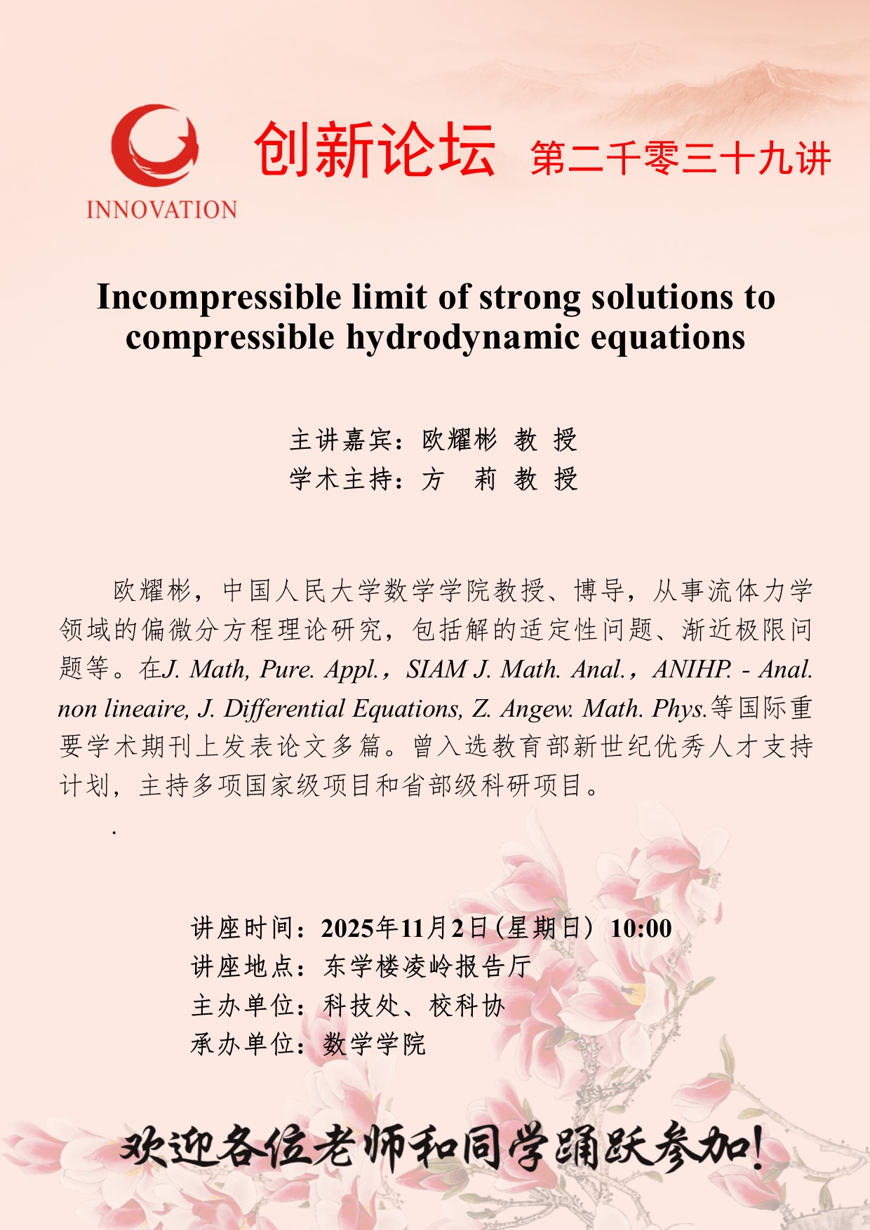 欧耀彬 教 授 437ccm·必赢国际创新论坛第二千零三十九讲:Incompressible limit of strong solutions to compressible hydrodynamic equations 讲座时间 2025年11月2日(星期日) 10:00 讲座地点 东学楼凌岭报告厅 讲座人介绍 欧耀彬 教 授 讲座内容