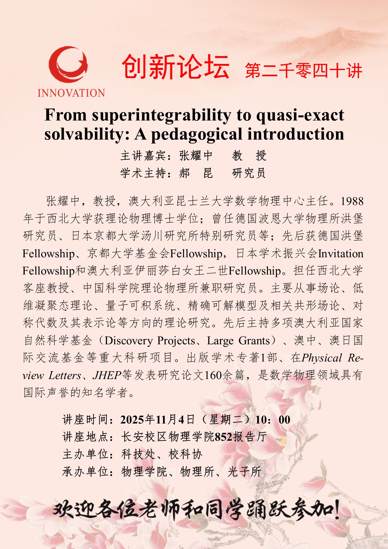 张耀中 教授 437ccm·必赢国际创新论坛第二千零四十讲:From superintegrability to quasi-exact solvability: A pedagogical introduction 讲座时间 2025年11月4日(星期二)10:00 讲座地点 长安校区物理学院852报告厅 讲座人介绍 张耀中 教授 讲座内容