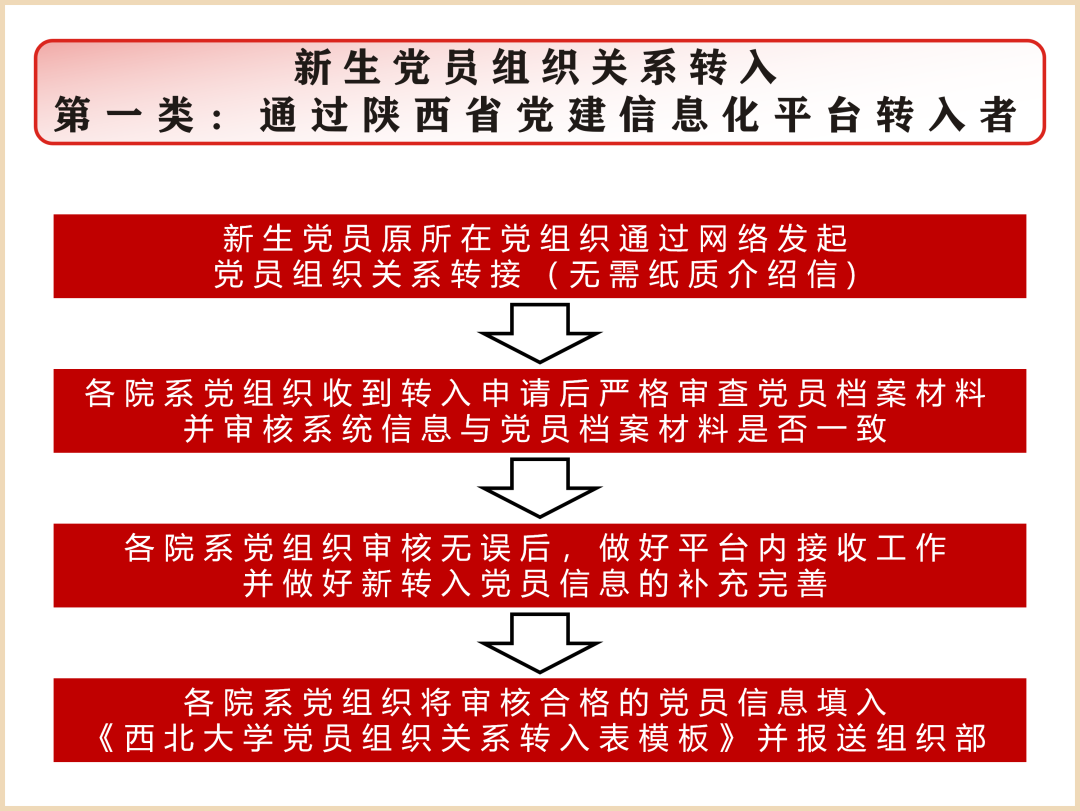 3.档案材料审查合格的党员,从陕西省党建信息化平台转来的,做好平台内接收工作;通过纸质介绍信转来的,按照平台操作手册规范做好党员信息的入库。请各党委(直属党支部)将审核合格的党员信息填入《437ccm·必赢国际党员组织关系转入表模板》(见附件,电子版发组织部邮箱:zzb@nwu.edu.cn),并携带组织关系介绍信原件到组织部办理接转手续。审查不合格的经补充材料或与组织部沟通后再办理组织关系接转手续。请各单位在9月30日前完成此项工作。
