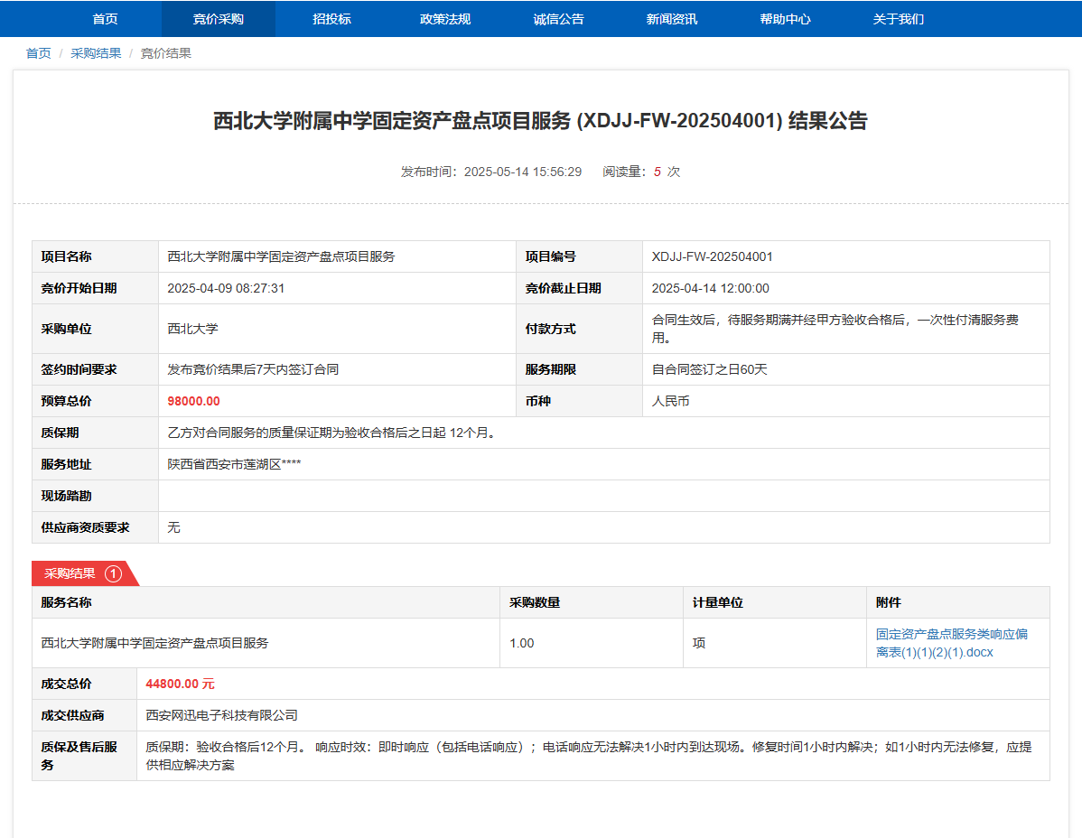 437ccm·必赢国际附属中学固定资产盘点项目服务(XDJJ-FW-202504001)竞价结果公告 作者:采购与招标办公室 编辑: 时间:2025-05-14 原公告链接:https://www.ejingcai.com.cn/site/bidding/detail/18218