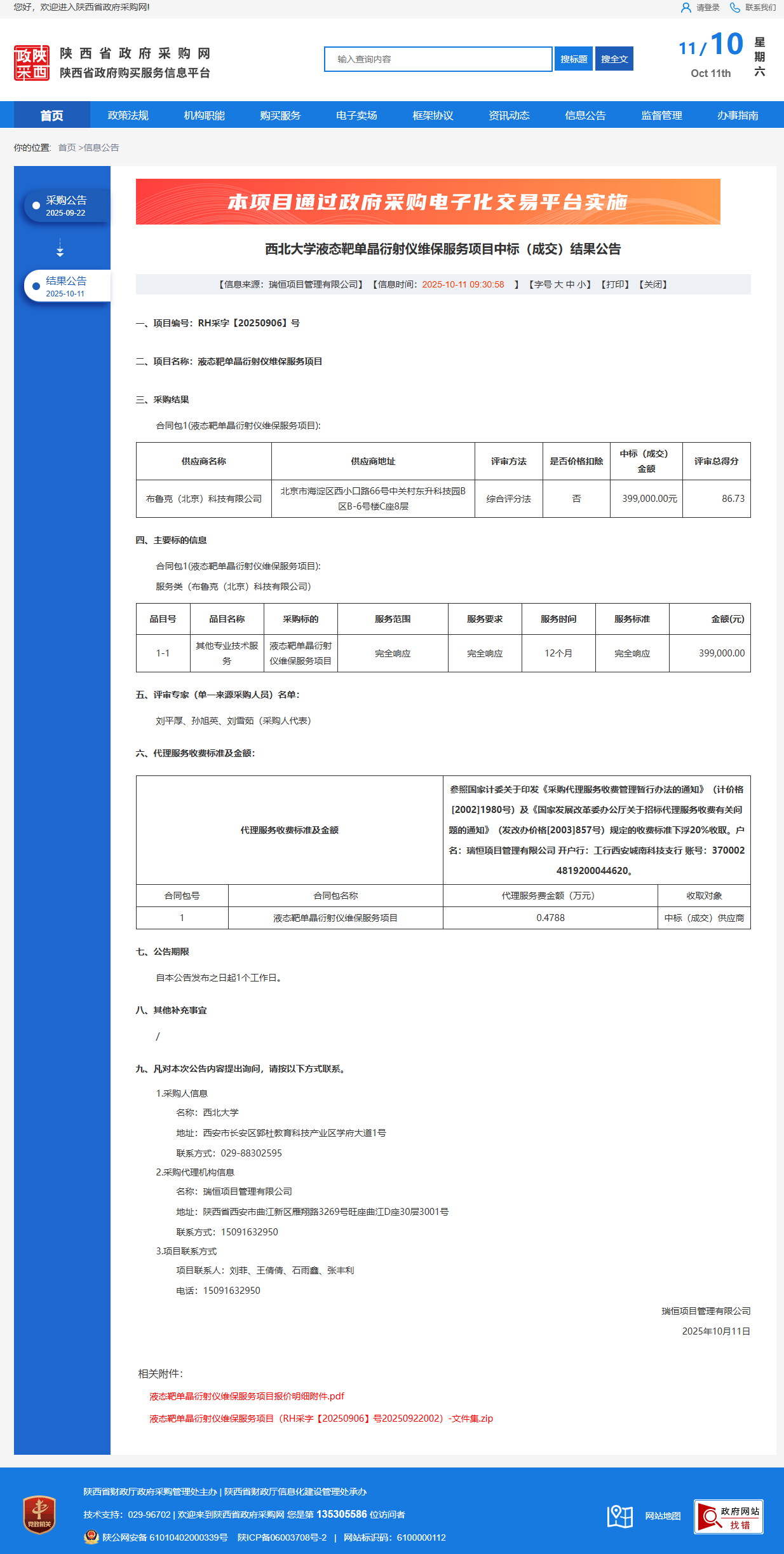 437ccm·必赢国际液态靶单晶衍射仪维保服务项目中标(成交)结果公告